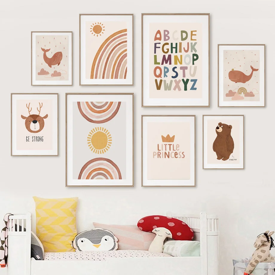 Абстрактный Лев, киты, солнце, радуга, буквы бохо, постеры и принты для детской комнаты, настенная Картина на холсте, настенные картины для детской комнаты