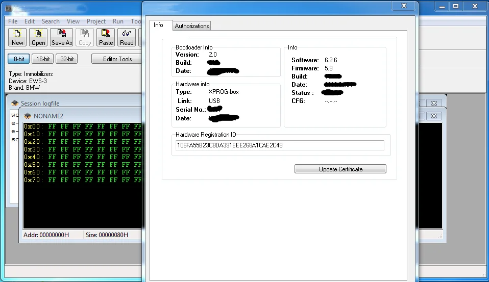 V6.26 включает в себя:AUTH-0001 для Motorola HC05 семейное разрешение (позволяет читать/писать EEPROM)AUTH-0002 для Motorola HC08 семейное разрешение (позволяет читать/писать EEPROM)AUTH-0003 для Motorola HC11 семейное разрешение (позволяет читать/писать EEPROM)AUTH-0004 для Motorola HC12, 9S12 семейное разрешение (позволяет читать/писать EEPROM и флэш-память)AUTH-0005 для Texas Instruments TMS370/TMS374 семейное разрешение (позволяет читать/писать EEPROM)AUTH-0006 для Motorola HC05Bxx и HC05Xxx семейное разрешение на обход (позволяет считывать/записывать защищенную EEPROM и флэш-память)AUTH-0007 для разрешения ST M35080. Считывание/запись/стирание устройства в состояние доставки.AUTH-0008 для авторизации BMW EWS3AUTH-0009 для семейного разрешения ATMEGA (позволяет читать/писать EEPROM и флэш-память)AUTH-0010 МБ ZGS001 авторизацияAUTH-0011 для Motorola HC11EA9/E9 bypass авторизация безопасности (позволяет обойти бит безопасности и считывать память EEPROM и RAM)AUTH-0012 для национального разрешения CR16 (позволяет считывать/записывать память EEPROM)AUTH-0014 для ST7, ST10 семейное разрешение (позволяет читать/записывать внутреннюю вспышку)AUTH-0015 для авторизации MPC5xx (в зависимости от программы устройства автоматически определяет MPC5xx, M95xxx тип устройства, флэш-память, внешняя вспышка и размер памяти конфигурации)AUTH-0018 для Motorola HC12, HC912, MC9S12, MC9S12X bypass авторизация безопасности (позволяет считывать/записывать защищенную EEPROM и флэш-память)AUTH-0020 для руки (микроны, ...) Семейное разрешение (позволяет считывать/записывать внутреннюю вспышку и внешний серийный EEPROM)AUTH-0021 для руки (микроны, ...) Семейное обозначение безопасности (позволяет считывать/записывать защищенную и незащищенную внутреннюю вспышку и внешний серийный EEPROM, просмотр/изменение пробега, номер шасси (VIN), серийный номер и пин-код).AUTH-0023-1 MAC7xxxAUTH-0023-2 XC23xxAUTH-0024-1 MC9S12CxxAUTH-0024-2 MC9S12XEAUTH-0024-3 9S12XE безопасностиAUTH-0024-4 MC9S12HA/HY/PAUTH-0025-1 MPC/SPC5xxx авторизованный 2016/3/13AUTH-0027-1 HC(S)908 обновление авторизованного 2016/3/13AUTH-0027-2 HC(S)908 sercurity авторизованный 2016/3/13AUTH-0028-1 для авторизованных 2017/10/9 Renesas V850AUTH-0028-2 для авторизованных 2017/10/9 Renesas SuperH