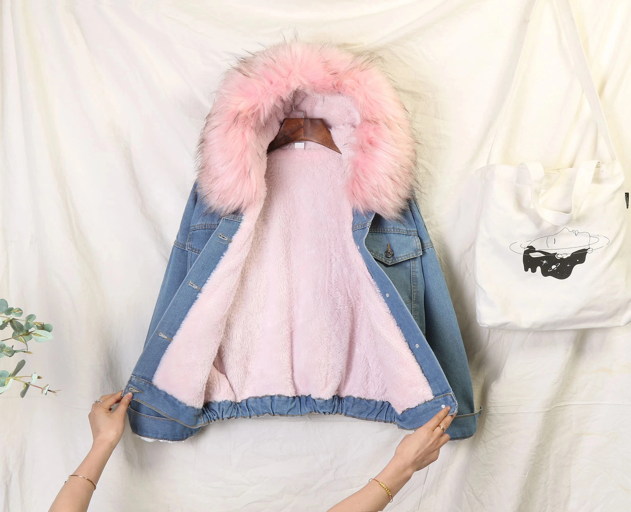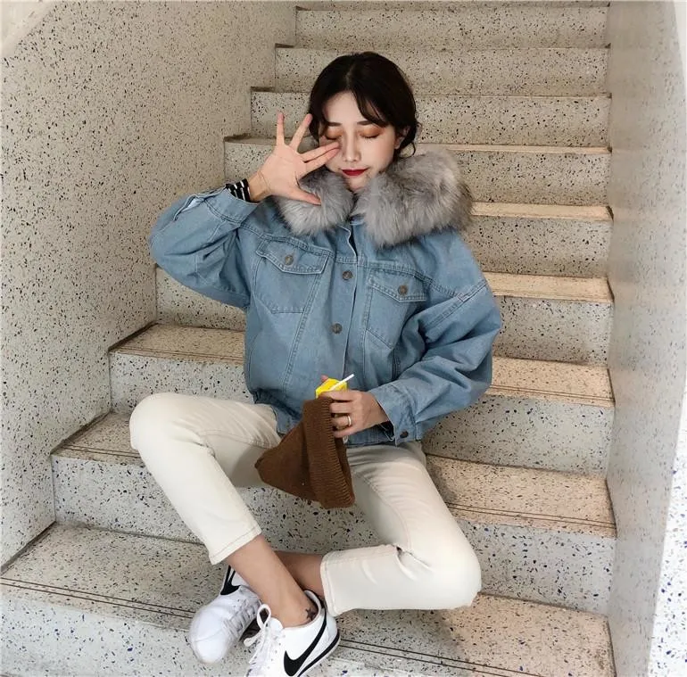 Женская джинсовая куртка с большим воротником из искусственного мех...
