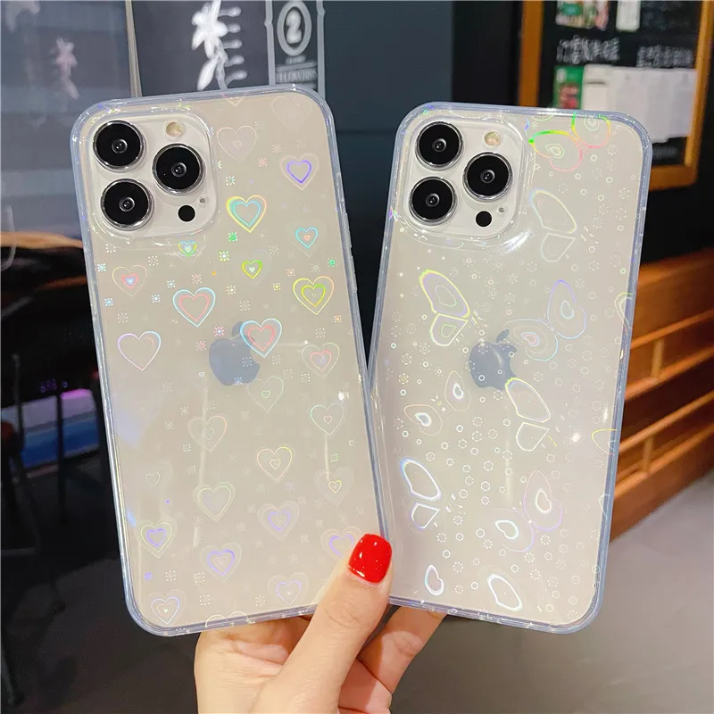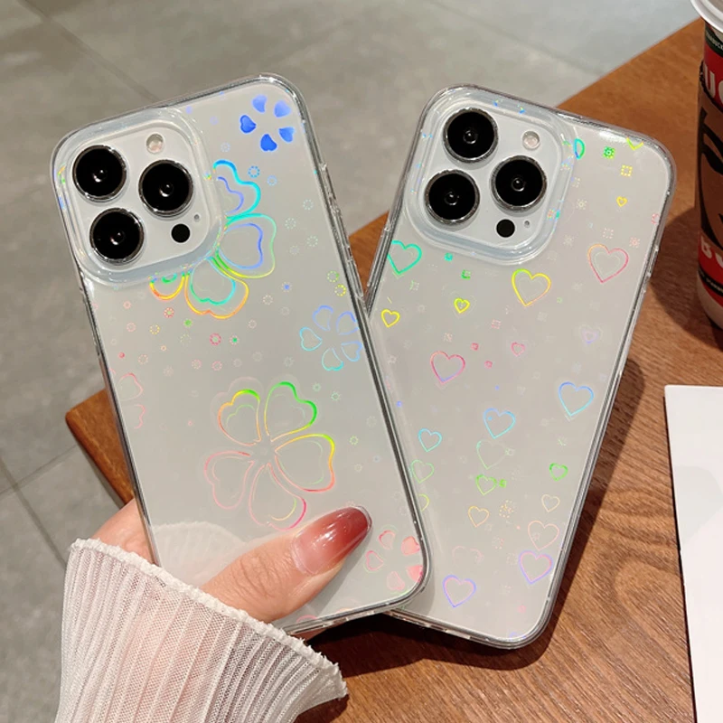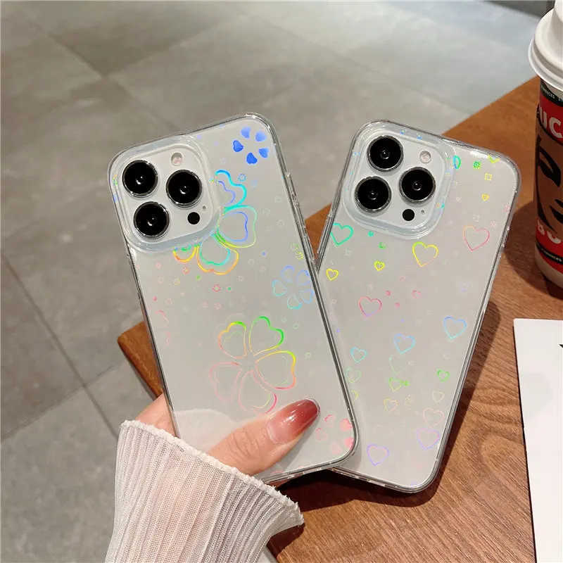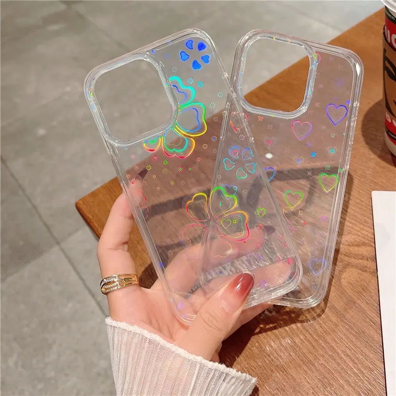 Прозрачный лазерный чехол для телефона с сердечками и листьями для ...