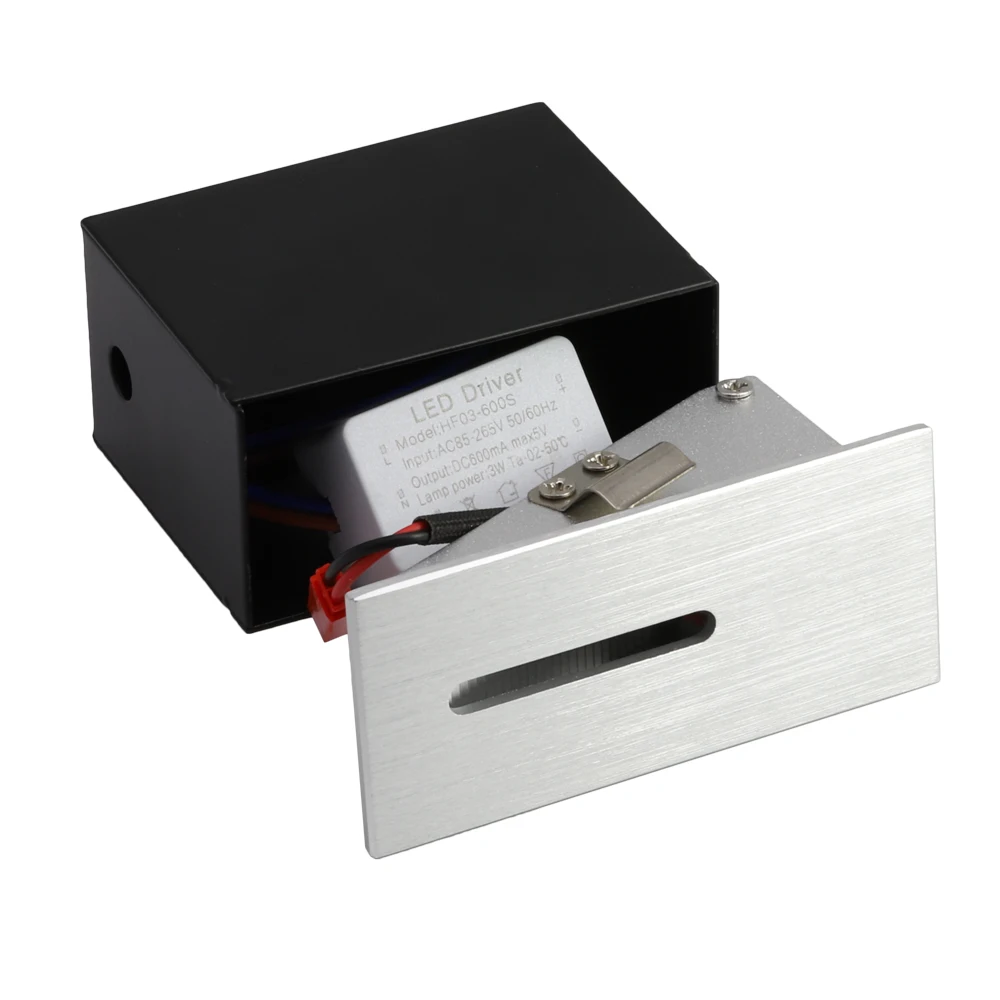 Мощность: 2 ВтВходное напряжение: 85-265 вЦветовая температура: WW(3000K),CW(6000K)Материал корпуса: алюминийСрок службы: 40000 чЦвет абажура: серебристый, белый, черныйОтверстие для резки: L72 * W38 * H55 ммCRI:≥ 80Водонепроницаемость: в помещении IP20Применение: лестница, шаг, прихожая, лестница, лестница, дом, отель, дорожка