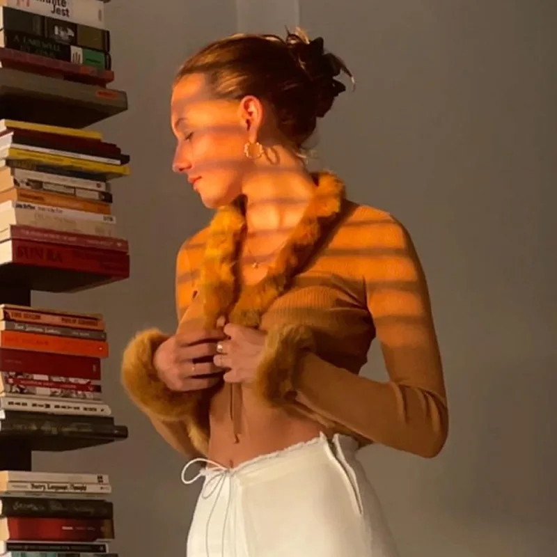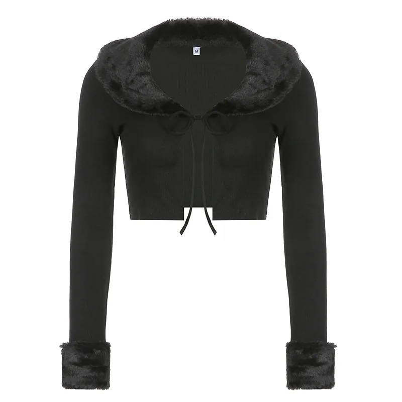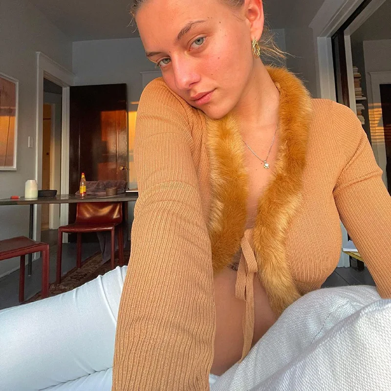 Укороченный топ с V-образным вырезом и длинным рукавом, женская белая повседневная трикотажная Сексуальная футболка 90-х годов, новинка 2021, осенне-зимняя куртка с меховым воротником