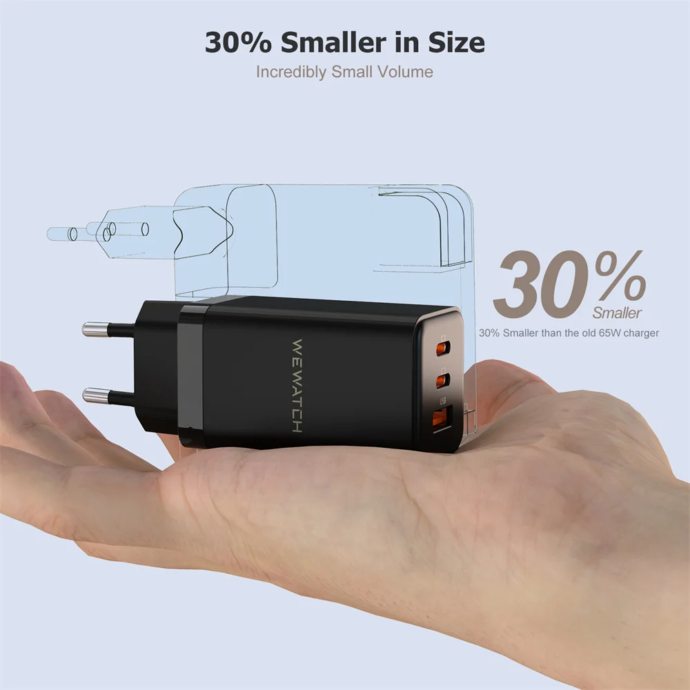 <Мини размер, больше мощности>: Зарядное устройство WEWATCH GaN не только на 30% меньше, чем аналогичные продукты, но также имеет максимальную выходную мощность 65 Вт. Портативный и универсальный.