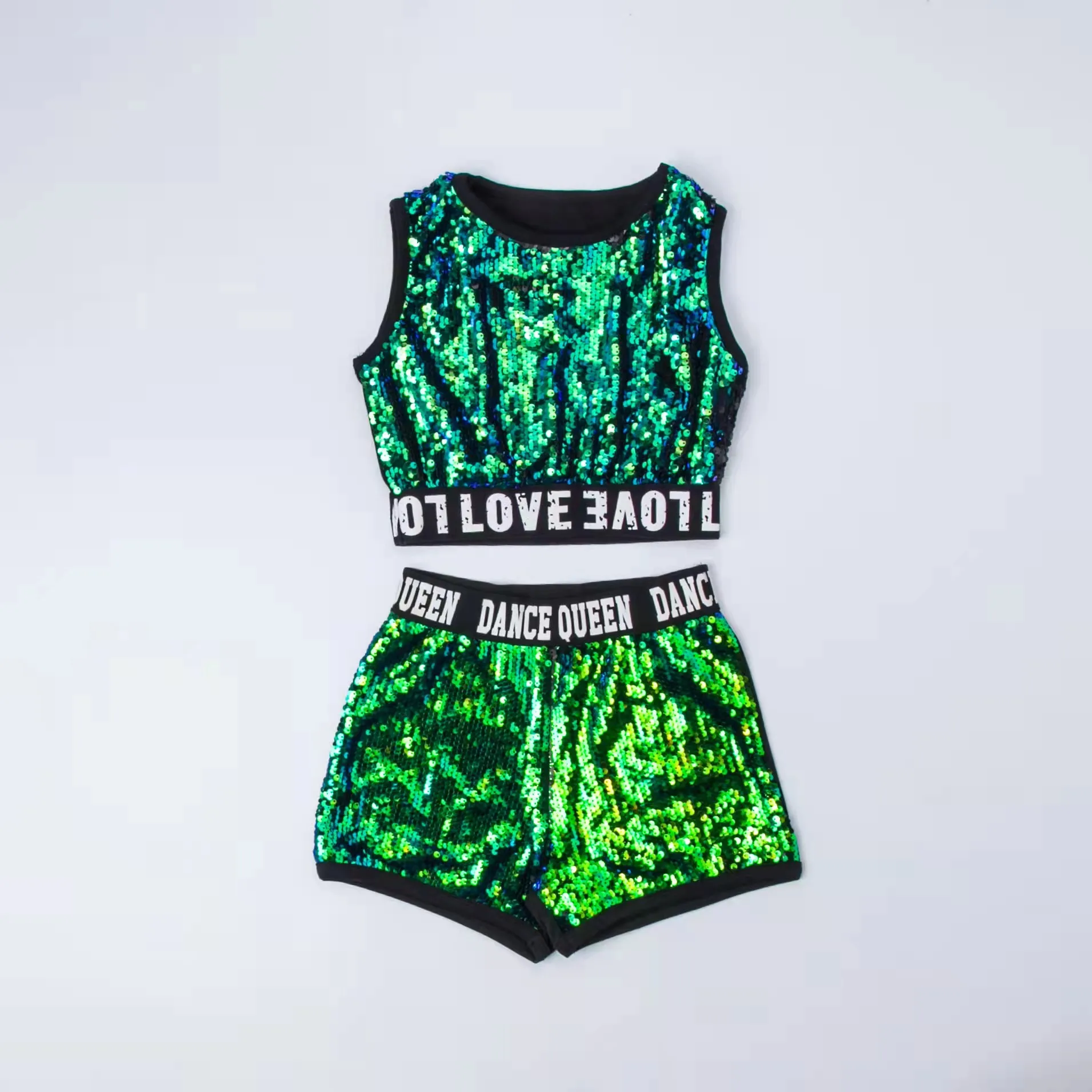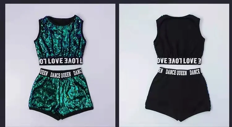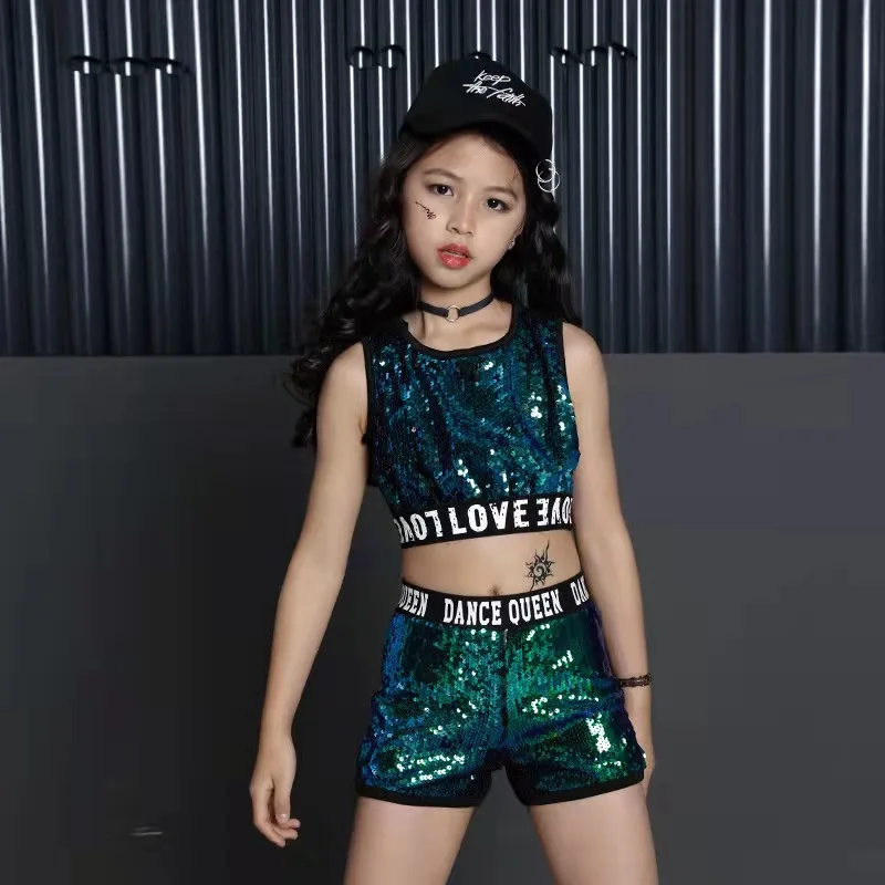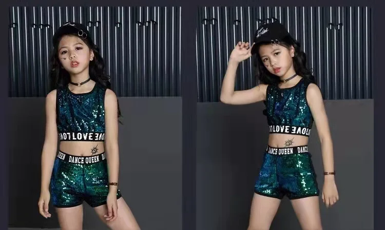 Детские джазовые танцевальные костюмы, одежда в стиле хип-хоп, Детская темно-зеленая одежда для девочек с блестками для современных танцев, детская одежда