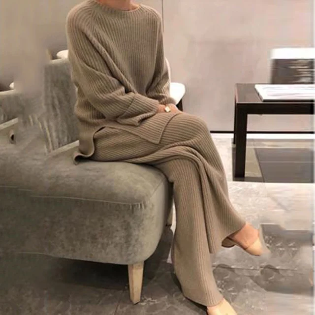 Женский вязаный свитер, гладкий и элегантный костюм, свитер с овальным вырезом + широкие брюки с бисером, комплект из 2 предметов, подходит для семьи,