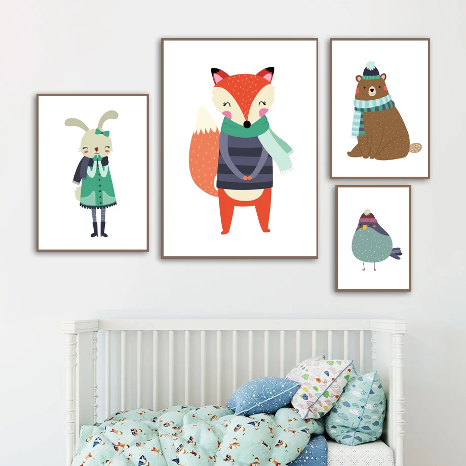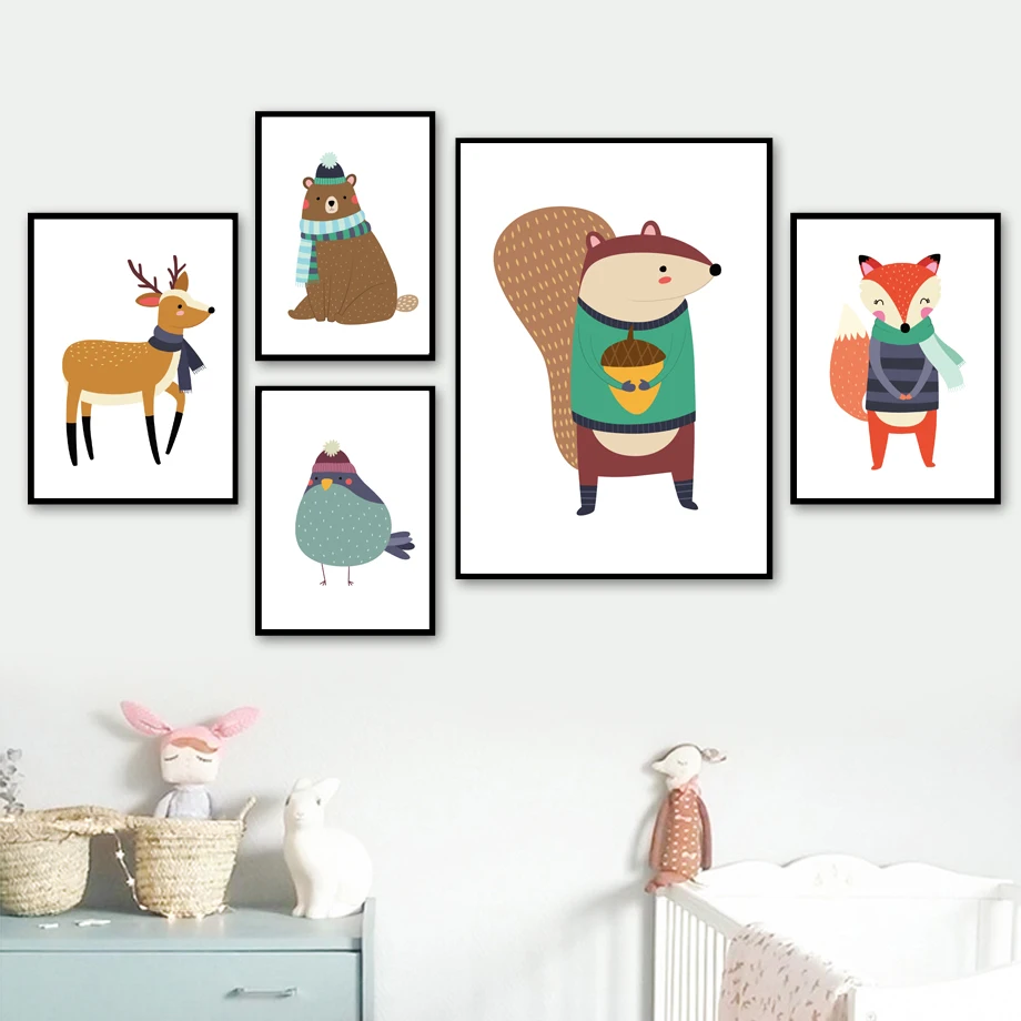 Искусство стен на холсте, картина на стену, мультяшный олень, лиса, белка, Медведь, Кролик, курица, декоративная картина для детской комнаты