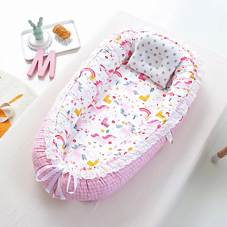 Многофункциональный-Используйте детское гнездо в качестве люльки для кровати, подушки для детского шезлонга, кровати для путешествий, подушки для новорожденных, смены места или перемещения вокруг Хо для отдыха или животика, делает ребенка более безопасным и уютным.