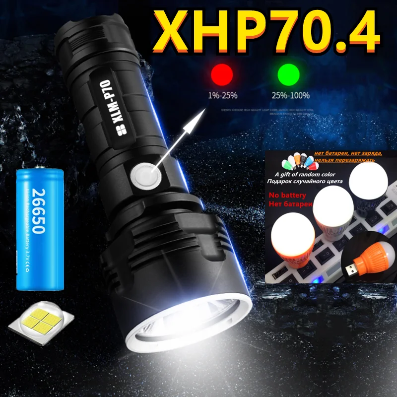 Светодиодный фонарик XHP70.4, супер мощный тактический фонарик, перезаряжаемый от USB, водонепроницаемый фонарь 26650, Ультраяркий фонарь