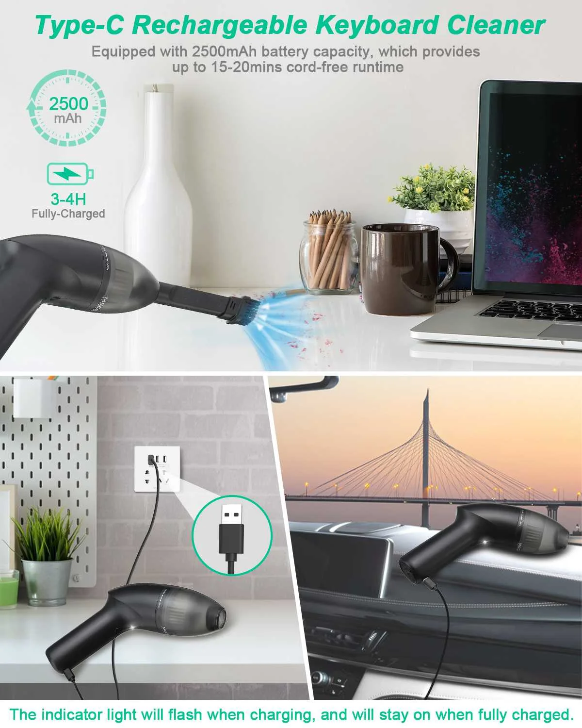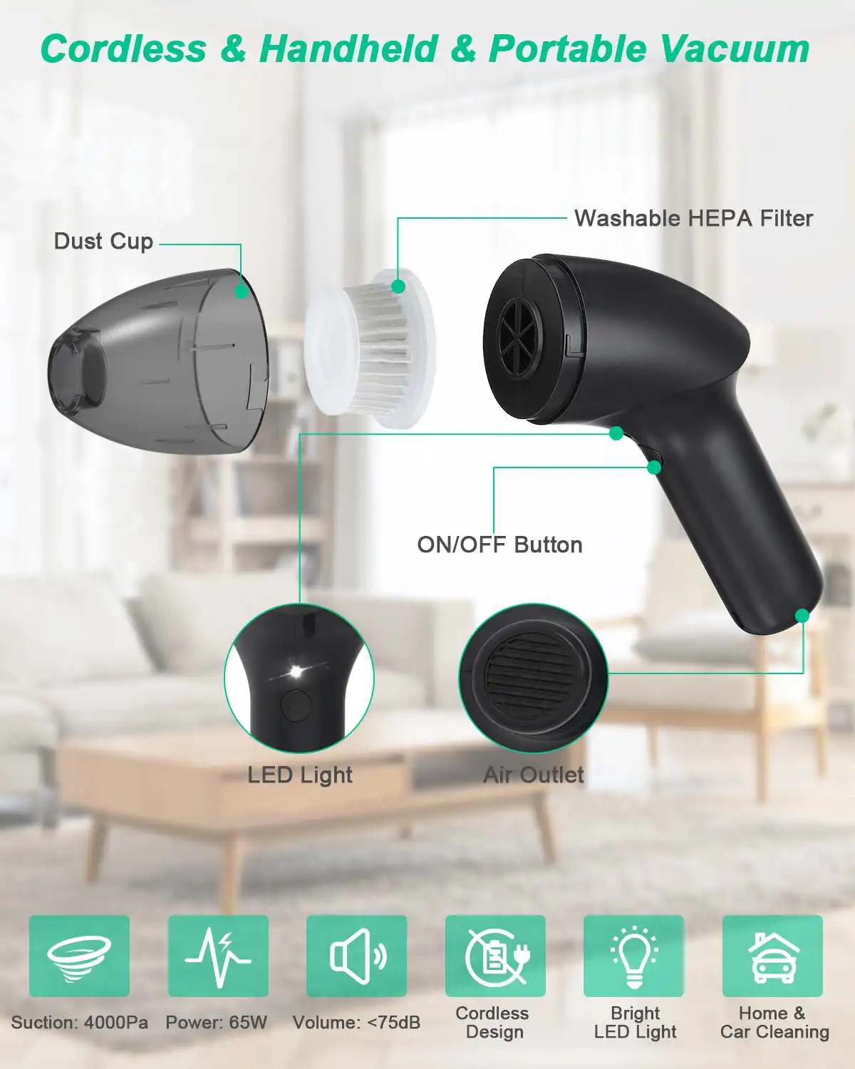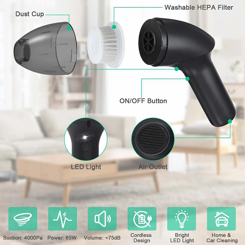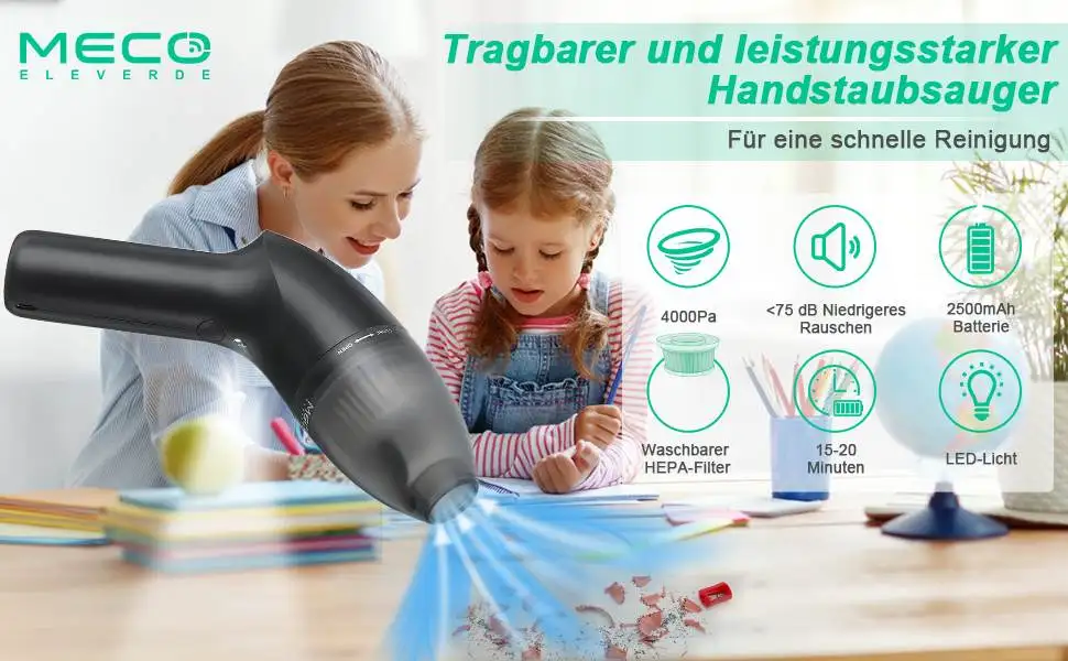 【Обеспечивает эффективное очищение 】Мини-пылесос MECO eeverde имеет мощность двигателя 65 Вт и мощность всасывания 4000 па. Он может легко впитывать волосы, остатки пищи, волосы домашних животных, сажу, бумажные кусочки и так далее. Обеспечивает всестороннюю защиту для вашего дома, офисного стола, салона автомобиля и кухонной среды.【Фильтры с лучшей производительностью 】Наш фильтрующий материал из ПТФЭ, который сильнее в фильтрации, он может фильтровать 99.6% пыли, предотвращать вторичное загрязнение, и он имеет лучший эффект фильтрации, чем другие. (Для того, чтобы продлить срок службы, стирка с водой не рекомендуется)【Очень полезный светодиодный светильник】Чтобы не игнорировать каждую деталь очистки, мы специально добавили светодиодный светильник, так что при очистке, вы можете использовать светодиодный светильник, чтобы четко видеть каждый угол, чтобы убедиться, что нет слепых углов. Это может эффективно очистить клавиатуру, компьютер или другое электронное оборудование.【Быстрая зарядка, легкий дизайн 】Перезаряжаемый пылесос оснащен литиевой батареей емкостью 2500 мАч, время зарядки составляет 3-4 часа, и он используется для зарядки около 20 минут после полной зарядки. Небольшой размер эргономичный, и чистка одной рукой не будет чувствовать усталость из-за веса. Действительно отпустите руки.【What 【комплектация】Есть небольшой пылесос, зарядный кабель (адаптер не входит в комплект), выдвижная насадка и сумка для переноски, принадлежности для хранения.