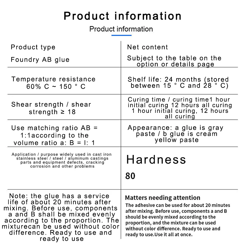 Примечание: клей имеет период использования около 20 минут после смешивания. Перед использованием компоненты A и B должны быть равномерно смешаны в соответствии с соотношением, и смесь может быть использована без разницы в цвете. Будьте готовы к использованию, используйте один раз.