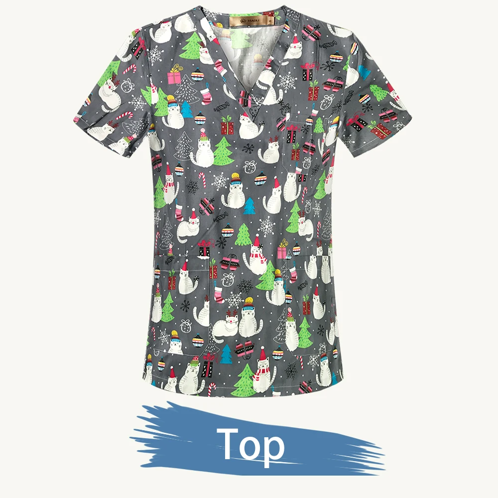 Рождественские печатные скрабы топы с V-образным вырезом Тонкий вет...
