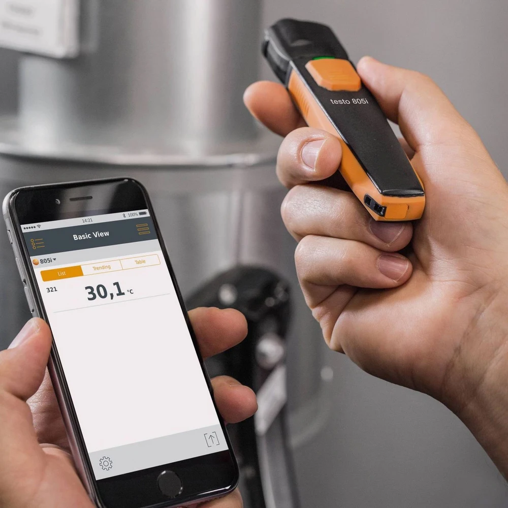 Testo 805i: Инфракрасный термометр ▶Бесконтактное инфракрасное измерение температуры поверхности ▶Измерительного пятна маркировки через хорошо видны 8-точечный лазерный круг ▶Простой выбор уровня выбросов через список сохраненных материалов ▶Документирование изображения с показаниями и измерительной точечной маркировкой Системные требования: IOS 8,3 или более поздней версии Android 4,3 или более поздней версии Bluetooth 4,0