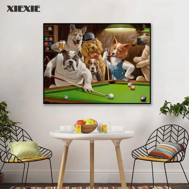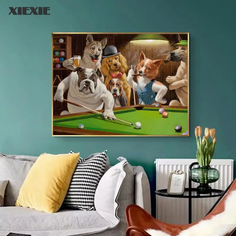 Картина на холсте с изображением собаки, бассейна, бильярдного стола