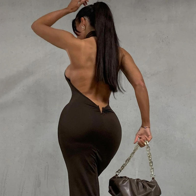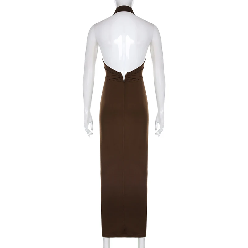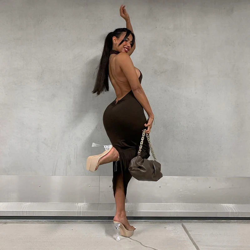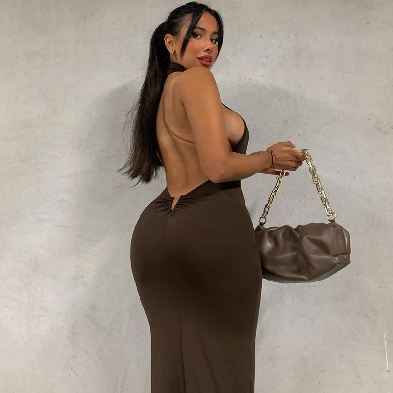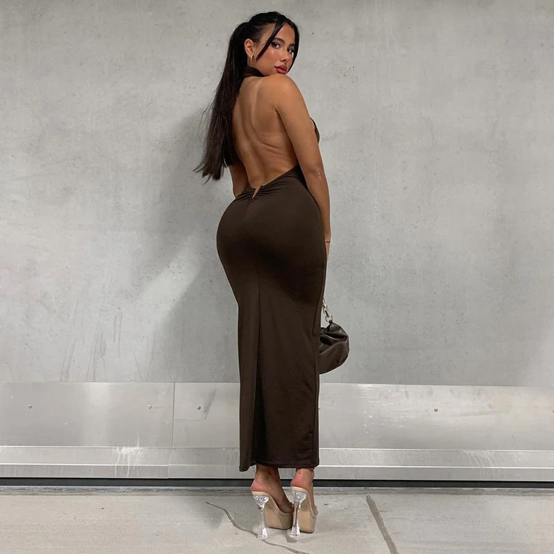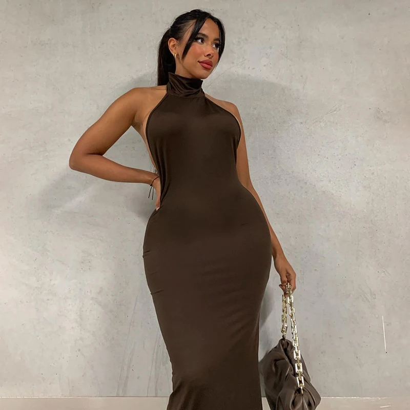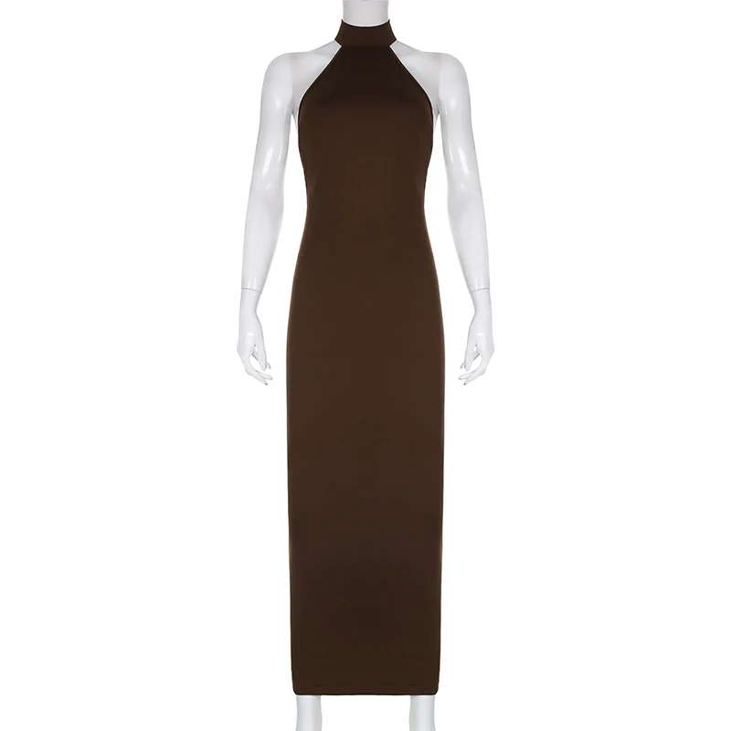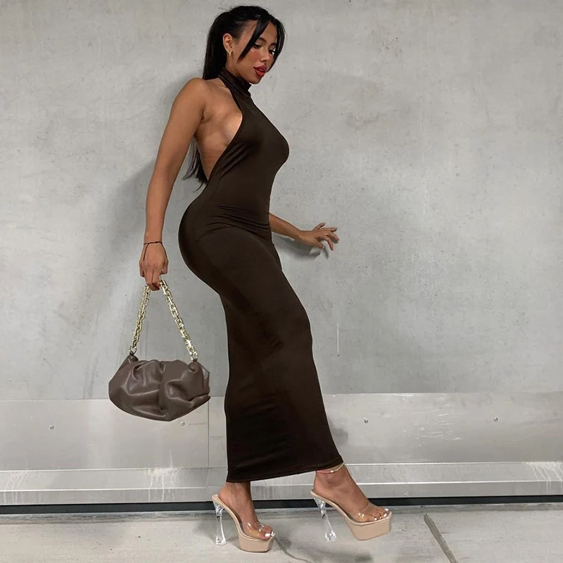 Простое однотонное винтажное платье BIIKPIIK для женщин, уличная одежда, облегающее пикантное женское Повседневное платье макси с открытой спиной и высоким воротником, подходящее ко всему