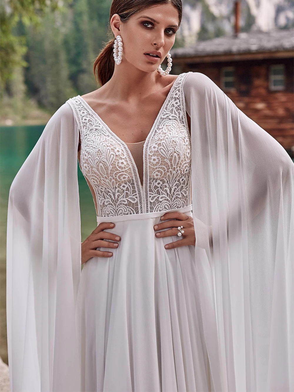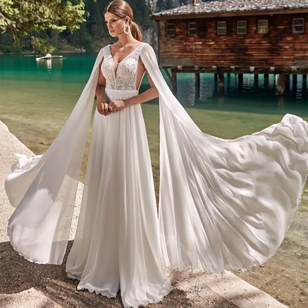 Очаровательное кружевное пляжное длинное шифоновое свадебное платье-накидка трапециевидной формы 2022 с V-образным вырезом и открытой спиной индивидуальный пошив уличное официальное свадебное платье для невесты