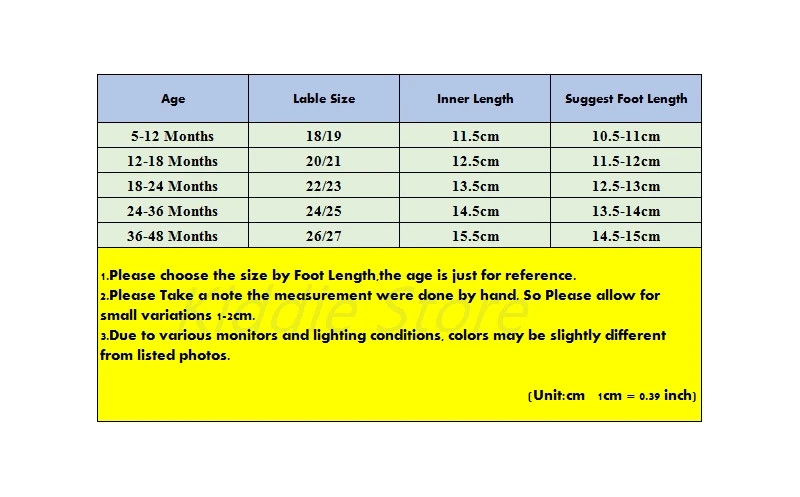(Единица измерения: см, 1 см = 0,39 дюйма)1. Пожалуйста, выберите размер по длине стопы, возраст указан только для справки.2. Пожалуйста, обратите внимание, что измерения были сделаны вручную. Поэтому возможны незначительные погрешности в 1-2 см.3. Из-за различных мониторов и условий освещения цвета могут немного отличаться от приведенных фотографий.