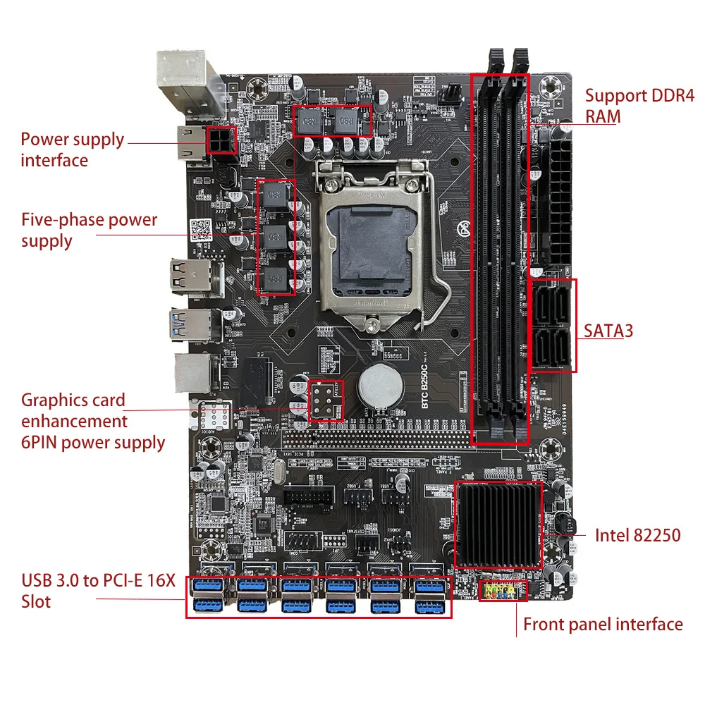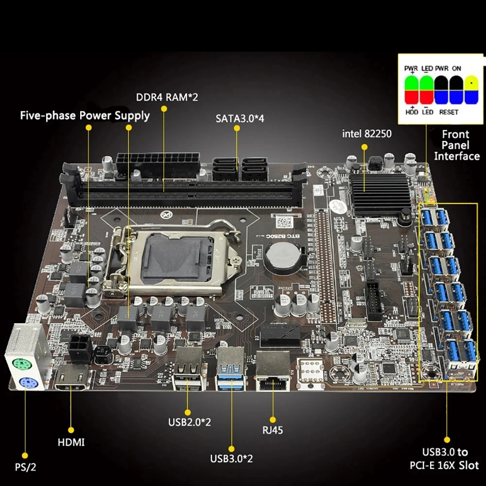 Характеристика:1. Инновационный дизайн, преобразование PCIE 1x непосредственно в интерфейс USB3.0, уменьшение промежуточных звеньев передачи, снижение затрат, снижение затухания сигнала и делает непрерывную долгосрочную работу более стабильной2. Обновление до совместимого hdmi-совместимого интерфейса дисплея высокой четкости, удобный и практичный3. Поддержка процессоров 6-го и 7-го поколения, LGA1151 проста в использовании, низкая стоимость, Низкие инвестиции и эффективная Добыча4. Этот продукт использует высококачественные материалы, прочный, имеет длительный срок службы, и является прочным и стабильным в использовании5. Расширение 12 портов USB3.0, подключи и работай, удобно и без проблемСпецификация:ЦП: Поддержка LGA 1151 Socket i3/i5/i7 series CPU
