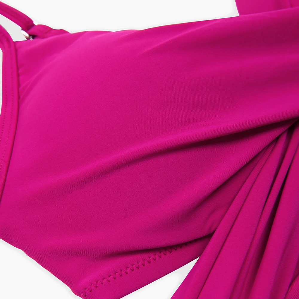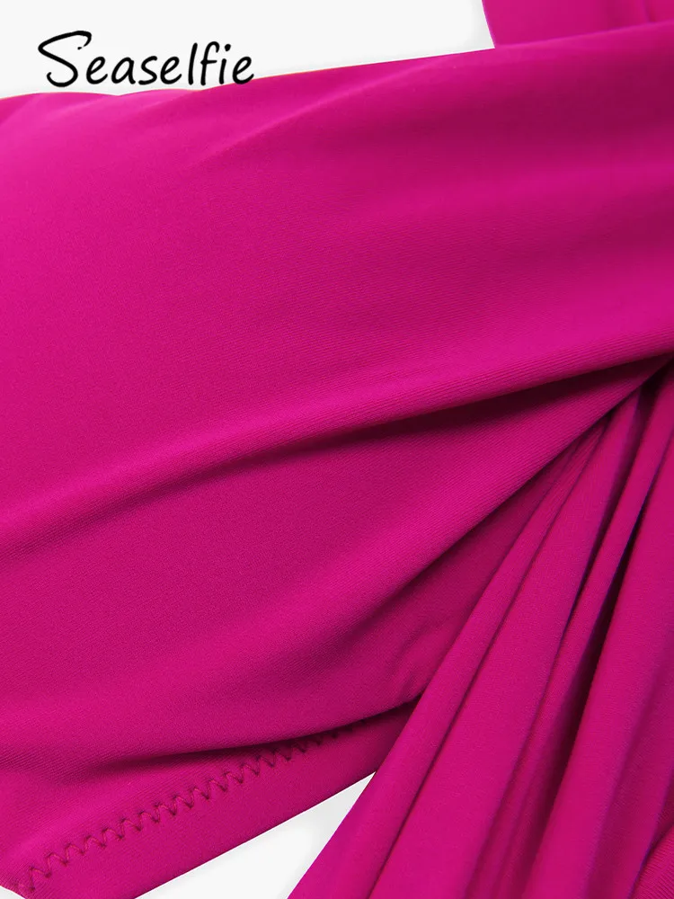 Поразите весь пляж в нашем бикини цвета фуксии с рюшами на спине. Особенности с дизайном обертывания и задней застежкой, спагетти и регулируемые ремни делают его более подходящим. Дизайн с высокой талией обеспечивает лестное покрытие желудка.