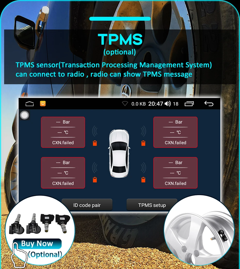 TPMSРадио может совместимо с системой контроля давления в шинах (TPMS). Когда вы подключаете TPMS к радио, вы можете видеть, что TPMS приводит к радиоэкрану. Радио также совместимо с внутренними TPMS и внешними TPMS. Если вы хотите купить TPMS, нажмите на эту фотографию.