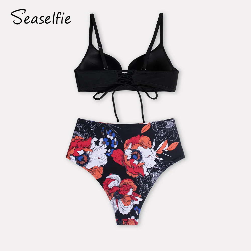 SEASELFIE бюстгальтер пуш-ап с высокой талией комплекты бикини для женщин черные цветочные сексуальные купальники из двух частей 2022 купальный костюм Купальники