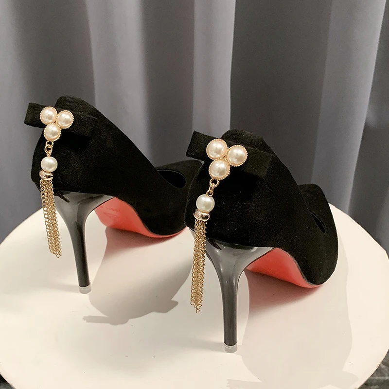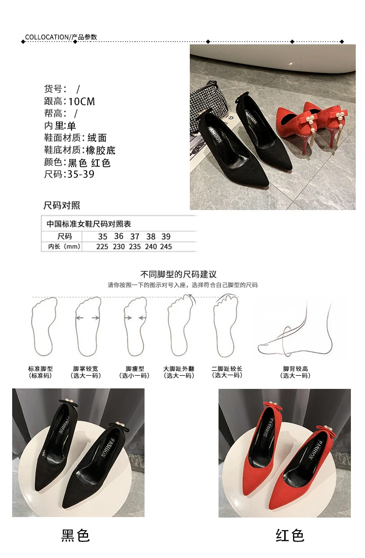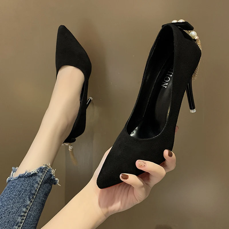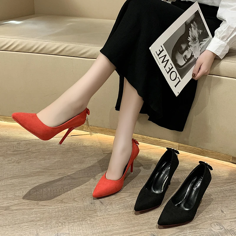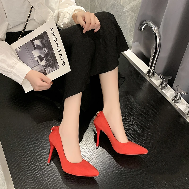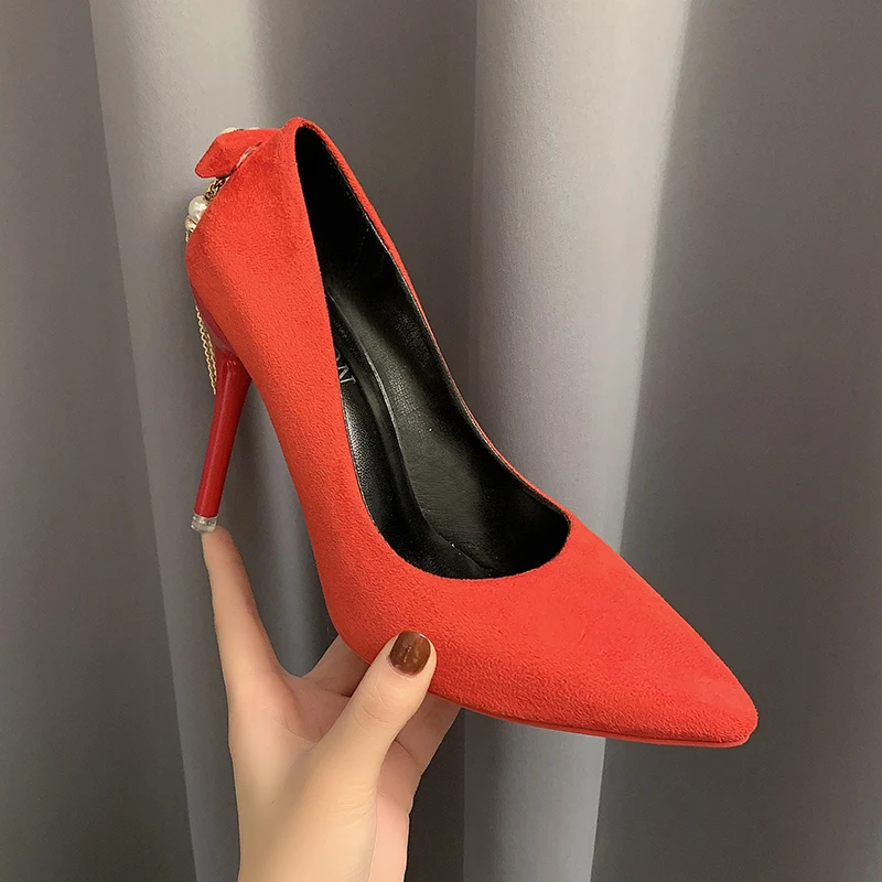 Женские замшевые туфли, заостренный носок, высокий каблук-шпилька, жемчужная бахрома, рабочая обувь, красные, на весну