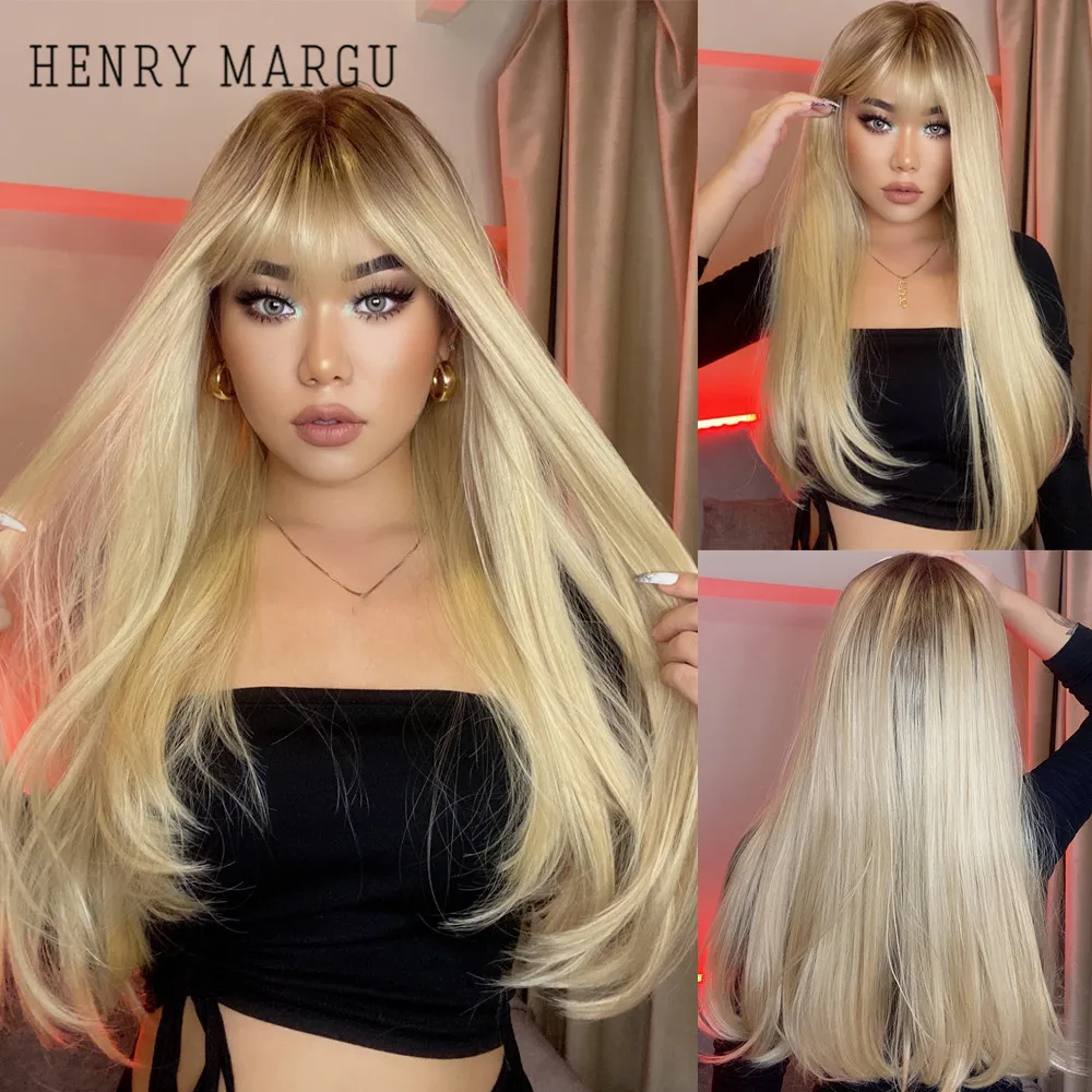 Длинные светлые прямые синтетические парики HENRY MARGU с челкой, светильник, блонд, платина, натуральные волосы с темным корнем для повседневного Косплея