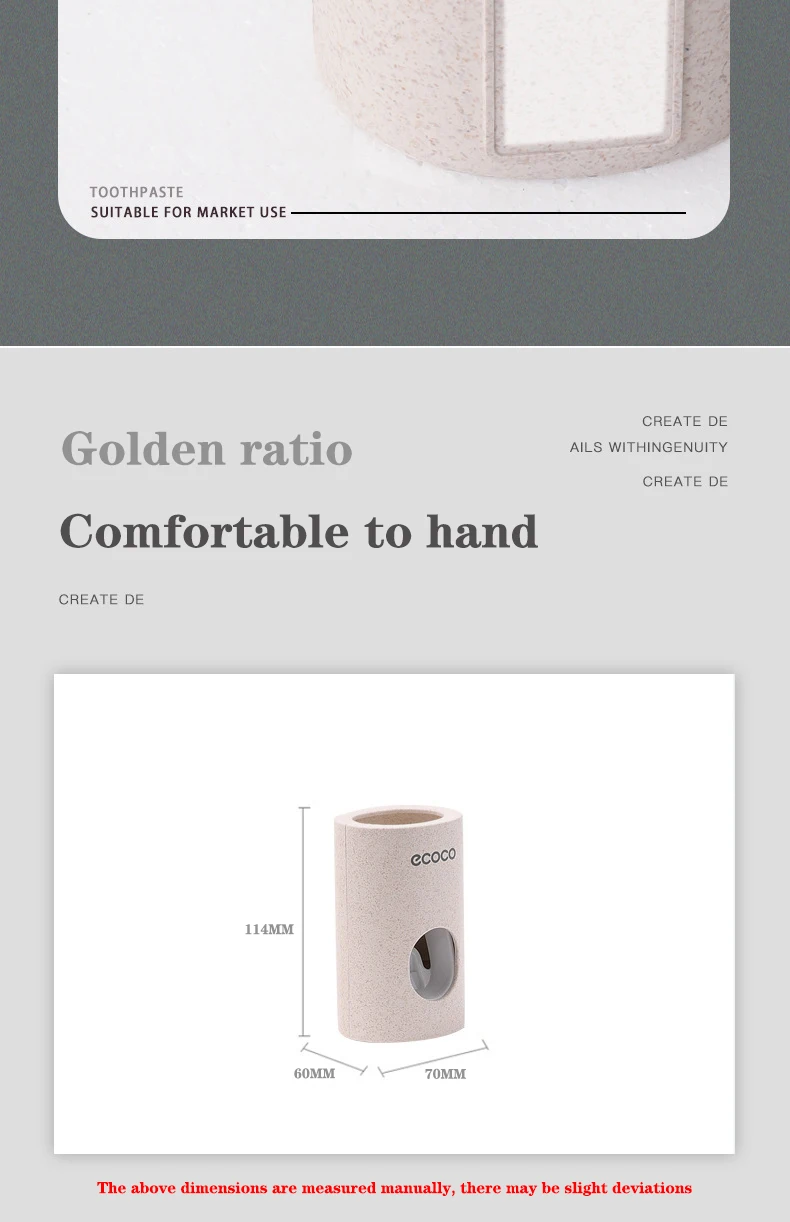 Особенности:Изготовлен из экологически чистой пшеничной соломы и высококачественного полипропиленового материала, не содержит металла, который биоразлагается и не имеет запаха.Использует технологию вакуумного насоса, откачивает зубную пасту без прямого прикосновения, благодаря экономичности и гигиеничности.Легко использовать, просто положите зубную щетку, и зубная паста будет выдавливаться без контакта, что экономит ваше время и освободит руки.Поставляется с наклейкой на спине, без необходимости пробивать стену.Компактный размер, не занимая слишком много места на стене, делая столешницу более аккуратной.Характеристики:Бренд: ECOCOЦвет: бежевыйМатериал: ПП + волокноТовар Размеры: 6*7*11,4 см/2,36*2,75 * 4.48inПосылка Размеры: 6,5*7,5*12 см/2,55*2,95 * 4.72inВес изделия: 110 г/3,88 унцийВес посылка: 135 г/4,76 унцийПосылка:1 * соковыжималка для зубной пастыПримечание:Протрите стену и убедитесь, что нет воды, прежде чем прикрепить наклейку.Подождите 12 часов после включения.
