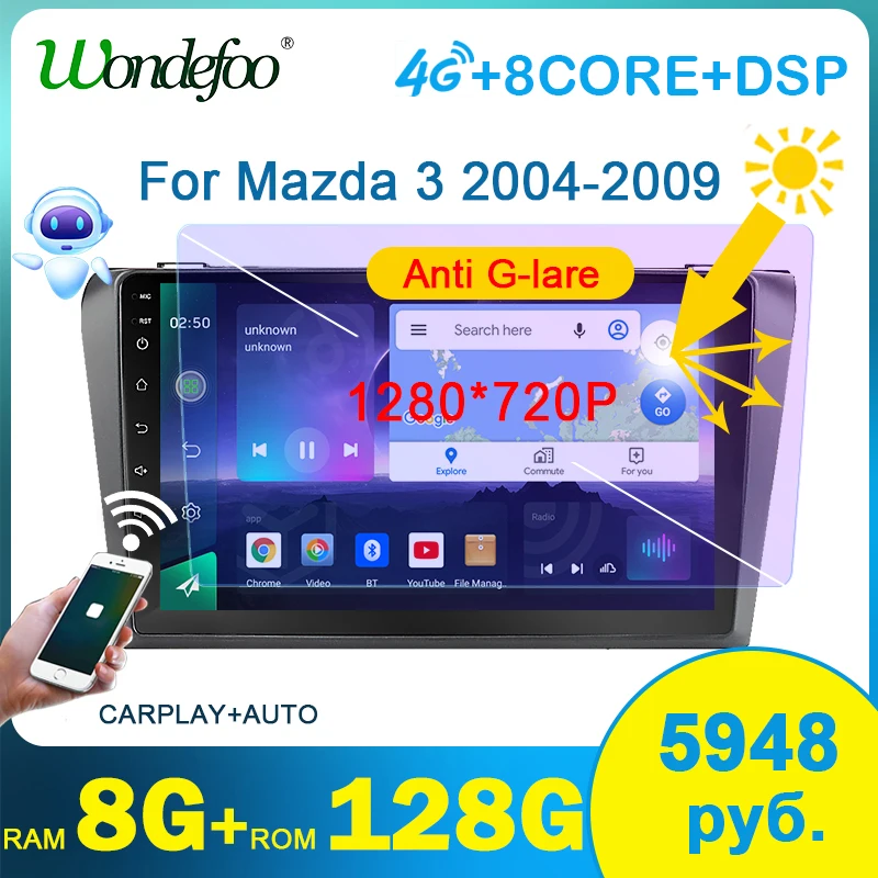 Автомагнитола Wondefoo, 2 din, Android 10, для Mazda 3 2004-2009, GPS, bluetooth