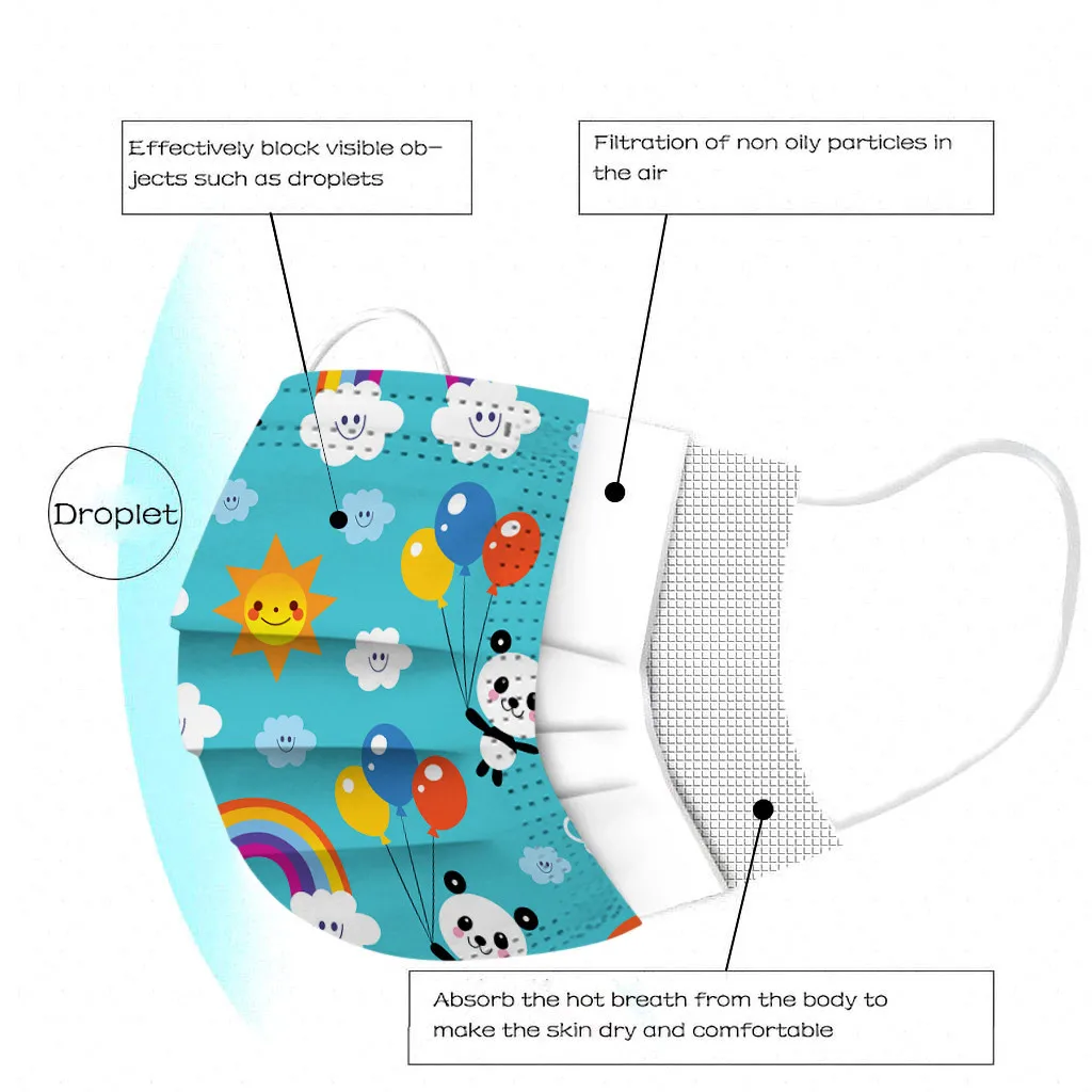 В 3 слоя Нетканая одноразовая маска изготовлена из 3 слоев нетканого материала, Безопасен и безопасен для использования. Дышащий материал и милый Узоры, которые делают его полезным и модным. Специальный 3 слоя из нетканого материала Дизайн, обеспечивает некоторую защиту от пыли, автомобильных выхлопных газов, Пыльца и т. д. эластичная Ушная петля, легко носить и не давит на уши. Маникюрный салон или любые другие области, где может потребоваться защита