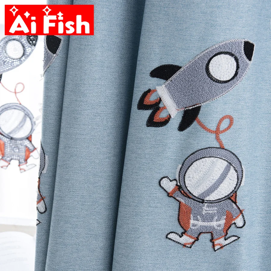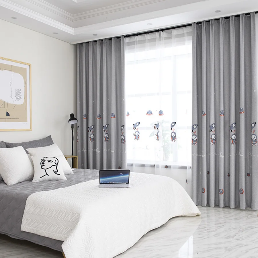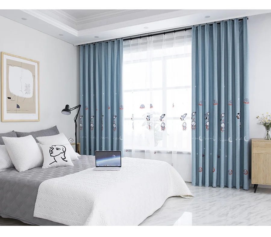 Детская комната мультфильм Серый мальчик девочка астронавт вышитые хлопчатобумажные льняные затемненные шторы Синий космос ракеты спальня драпировка