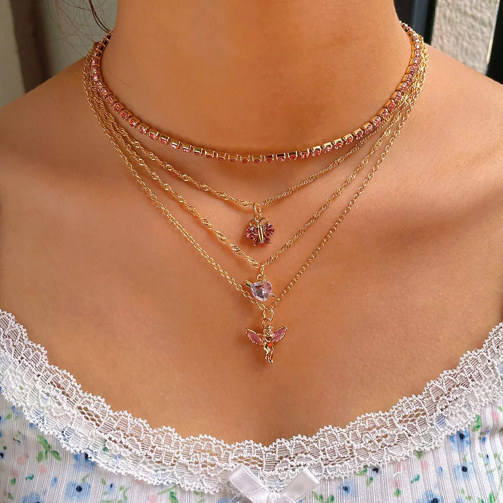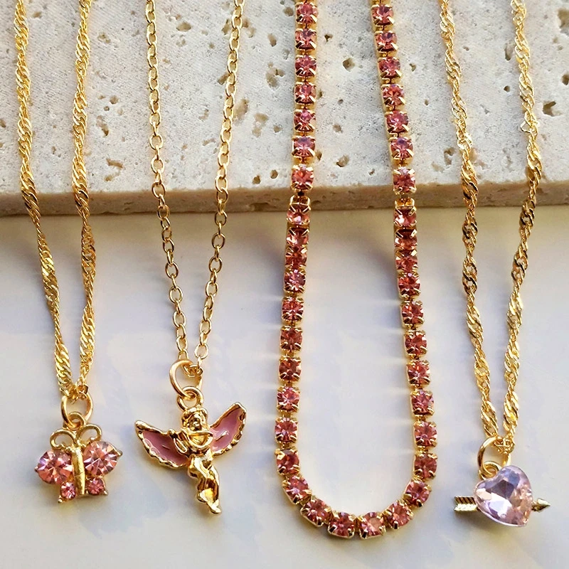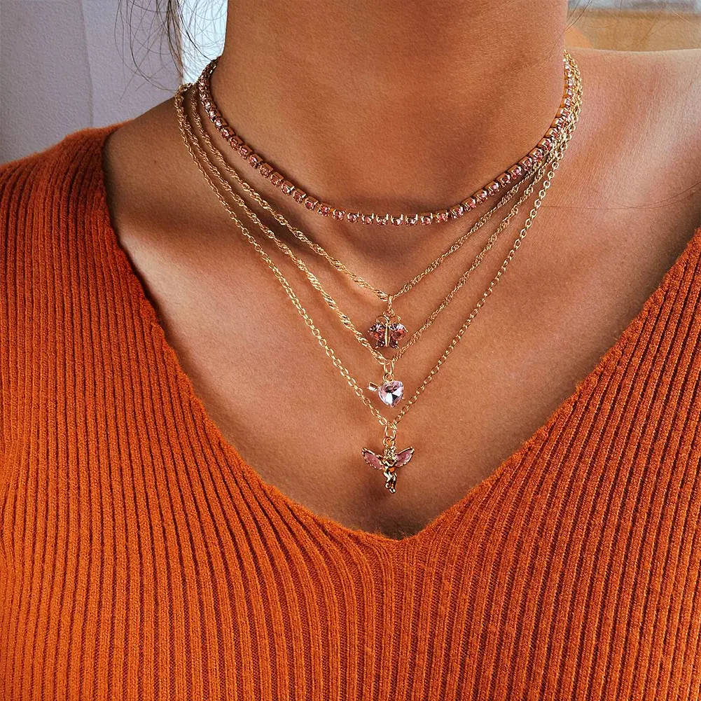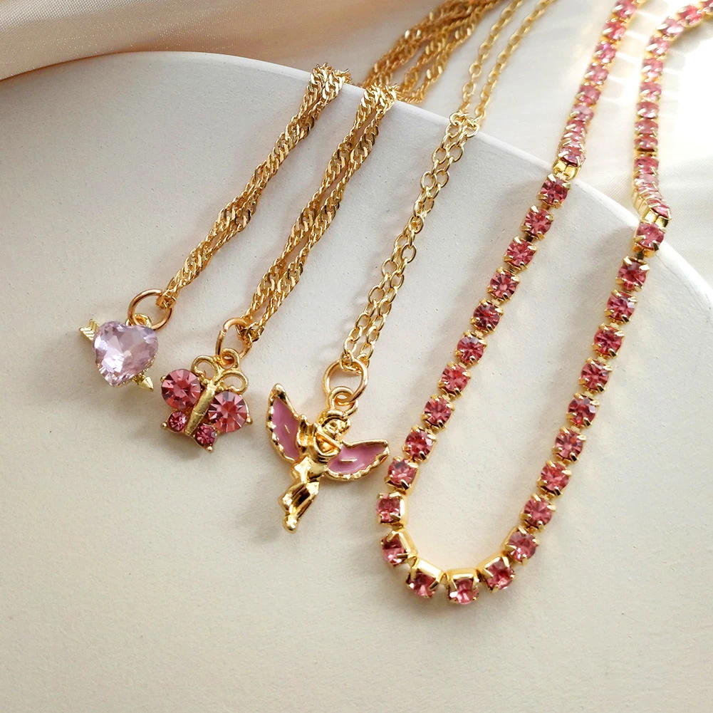 Женская многослойная цепочка Flatfoosie, ожерелье-чокер с розовыми ангельскими сердцами и кристаллами, модные ювелирные украшения