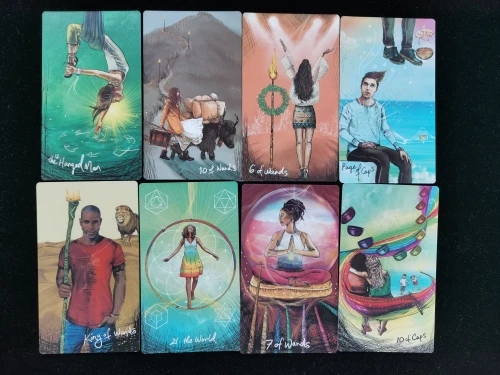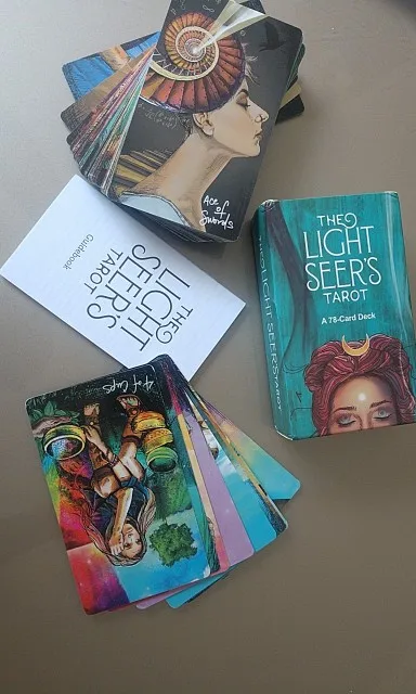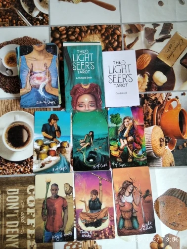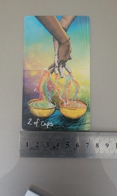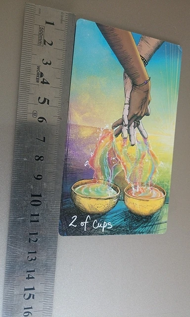 Заказала 5.12, отправили 10.12, получила в постомат 23.12. Огромный минус продавцу за упаковку. Это просто почтовый конверт с тонкой пупыркой. Все углы помялись и две карты тоже. В остальном всё хорошо. Карты большие 12х7, плотные, яркие, контрастные, гладкие, хорошо тасуются. Прикрепила фото для сравнения с версией 10х6, у которых изображения не контрастные. У некоторых карт прям большая разница в цветопередаче, у некоторых минимальная и на первый взгляд не заметная. У новых карт рубашка ярче и сочней. На некоторых картах изображения чуть обрезаны по правому краю, это хорошо видно на аркане Сила. Картами довольна.