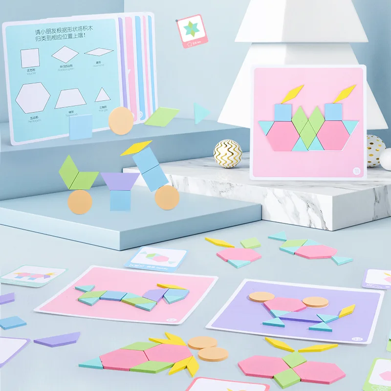 Детские деревянные 3D Пазлы геометрической формы Tangram, пазлы для детей, Разноцветные деревянные Обучающие игрушки Монтессори для малышей