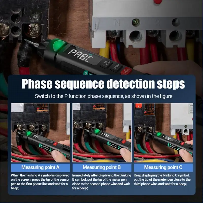 Универсальный мультиметр-ручка: Этот мультиметр отличается испытанием напряжения/сопротивления/емкости/диода/частоты/температуры, непрерывности, нулевой линии и бесконтактной фазы обнаружения последовательности и т. д.