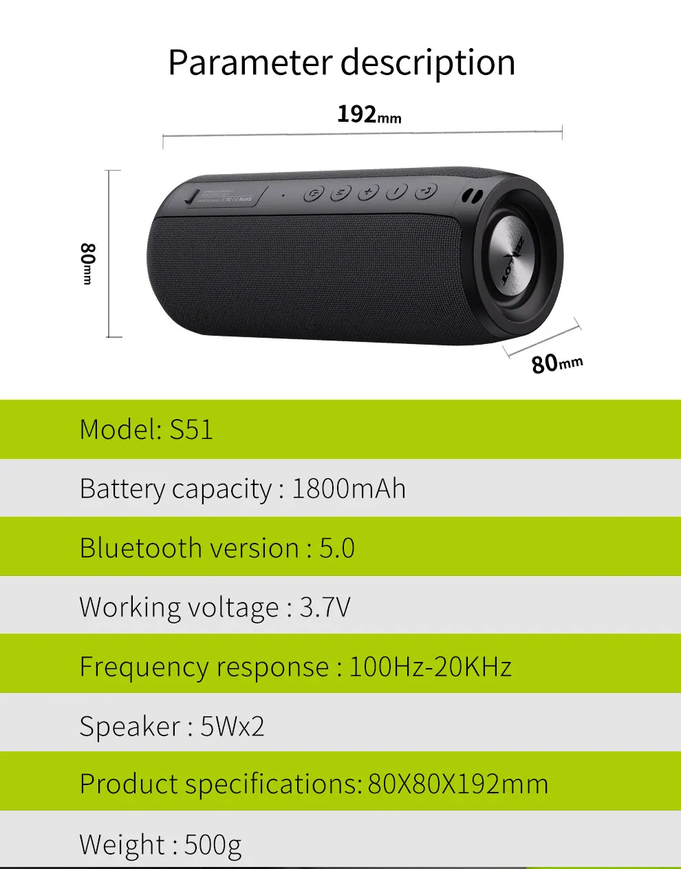 S51 Особенности продукта: 1. Bluetooth: 5,0 2. Аккумулятор: 1800 мАч 3. Громкоговоритель: 4 Ω, 2*5W 4. Дальность передачи: 10 м 5. Размер изделия: 8 см x 8 см x 19,2 см 6. Вес продукта: 500 г 7. Время воспроизведения музыки: 4-6 часов 8. Время работы в режиме разговора: 6 часов 9. Время зарядки: 3 часа 10. Время работы в режиме ожидания: 30 дней 11. Совместимость с Iphone, телефонами Android, IPad 12. Переключение режима: Нажмите кнопку M, чтобы переключить режим BT, TF, USB, AUX, FM 13. Режим FM: в режиме FM нажмите кнопку паузы для автоматического поиска каналов, нажмите кнопку (-) для переключения на предыдущую станцию и удерживайте (+) кнопка для переключения на следующую станцию Упаковочный лист: 1 х Zealot S51 bluetooth динамик в подарочной коробке 1 x зарядный кабель 1 x Руководство пользователя