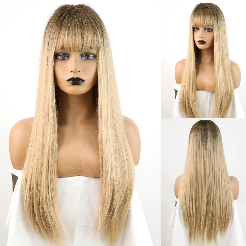 Парики из синтетических волокон Омбре, коричневые, светлые, золотистые, с челкой, средний длинный парик для женщин, косплей, вечерние, термостойкие, искусственные волосы