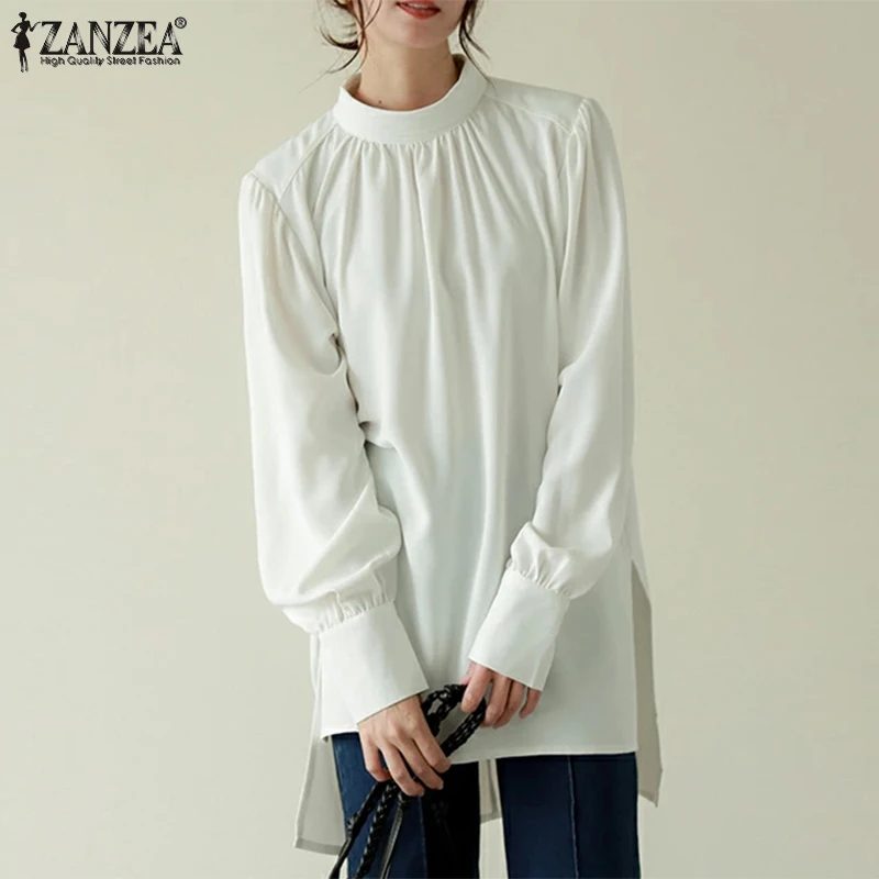 Блузка ZANZEA женская с круглым вырезом, однотонная модная повседневная рубашка на пуговицах и манжетах, праздничный Топ оверсайз в богемном стиле, с буффами на рукавах, осень 2022