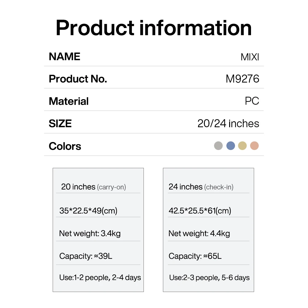 Mixi великолепный чемодан с широкой ручкой, Дорожный чемодан 24 дюйма, роликовые колеса для женщин и мужчин, кабина для переноски 20 дюймов, твердый патентный дизайн M9276