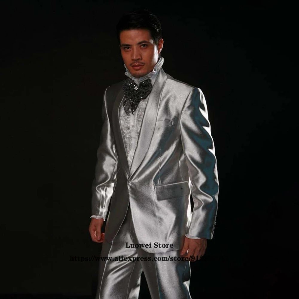 Модные серебряные мужские костюмы для жениха, свадебный смокинг для выпускного вечера, комплект из 2 предметов, пиджак и брюки, официальный деловой Блейзер, мужской костюм