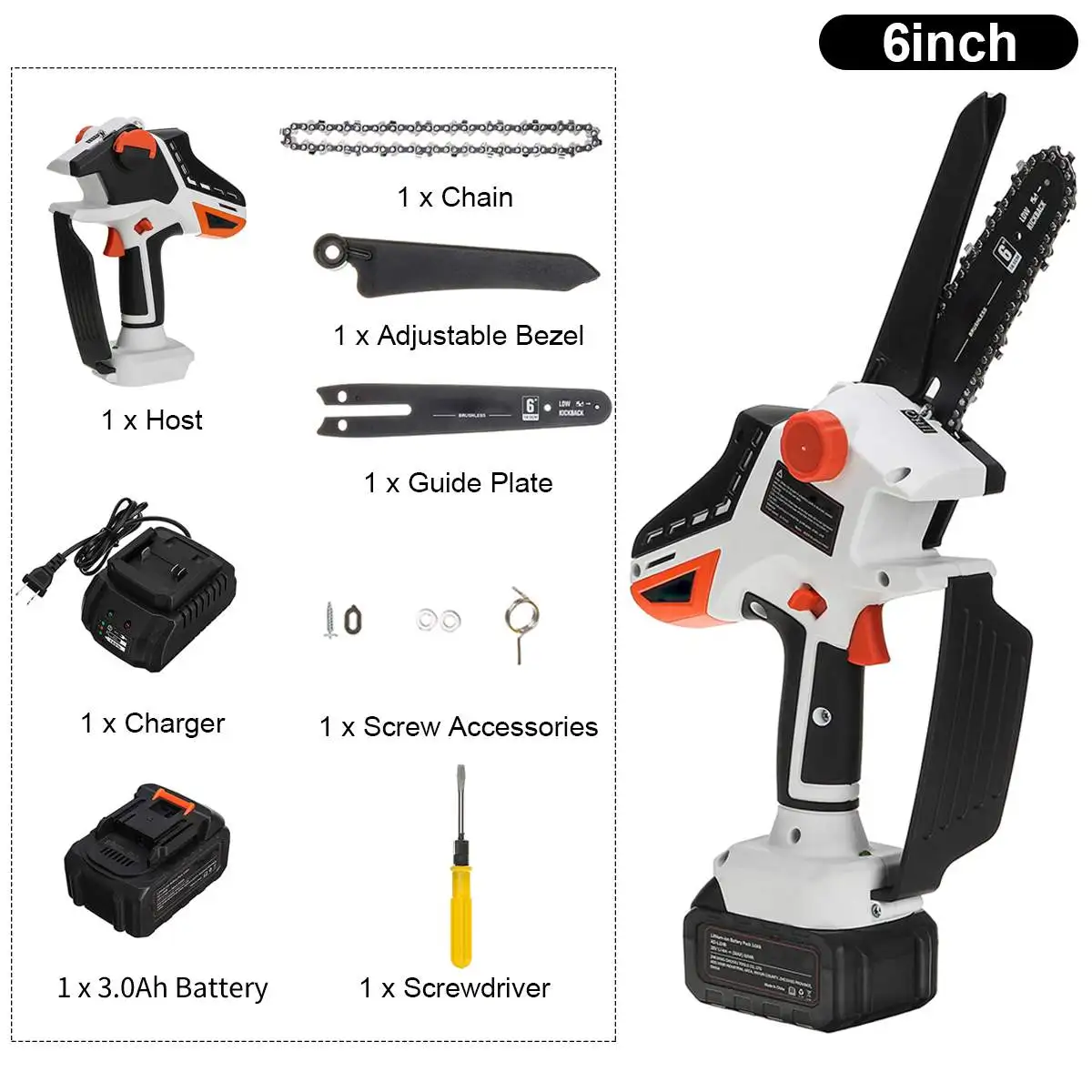 1 хостЗарядное устройство-1 шт.1 х литий-ионный аккумулятор 3.0Ah1 x цепь1 x Регулируемый ободок1 x направляющая пластина1 х винтовые аксессуары1 отвертка