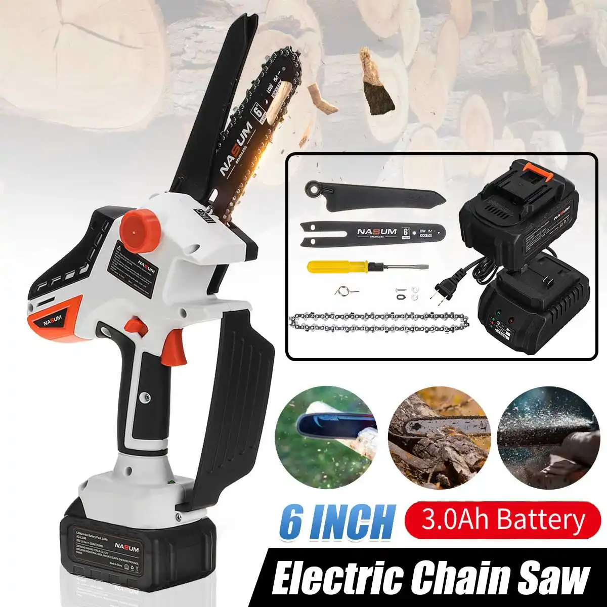 Электрическая пила с бесщеточным двигателем, 6 дюймов, 450 Вт, для обрезки садовых деревьев, с литий-ионным аккумулятором, 3,0 Ач, вилка стандарта США