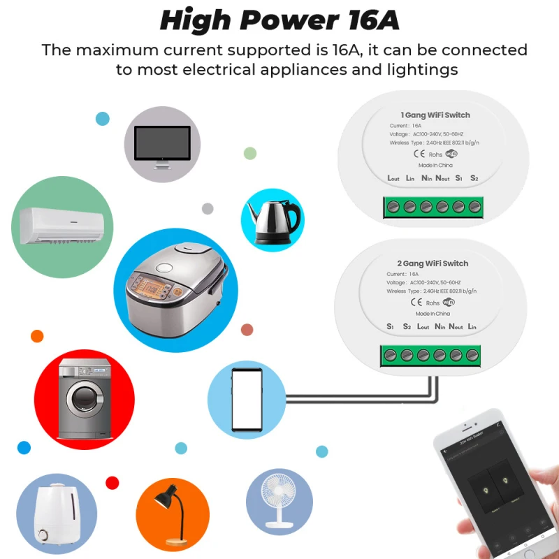 Умный модуль переключателя Wi-Fi 2 банды может быть установлен за кассетой переключателя для управления переключателем 2 банд или управления лампами 2 светильник. Он поддерживает два способа одновременно, поворачивая неумные лампочки или Переключая их в интеллектуальное управление, обеспечивая включение и выключение управления, синхронизацию и Голосовое управление (Alexa, Google assistant) и обмен данными, функции группового контроля. В то же время, он также может создавать умные сцены с другими смарт-устройствами в приложении для достижения связи сцены. (Приложение: Smart Life/Tuya smart)