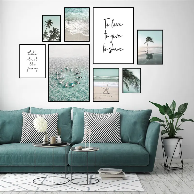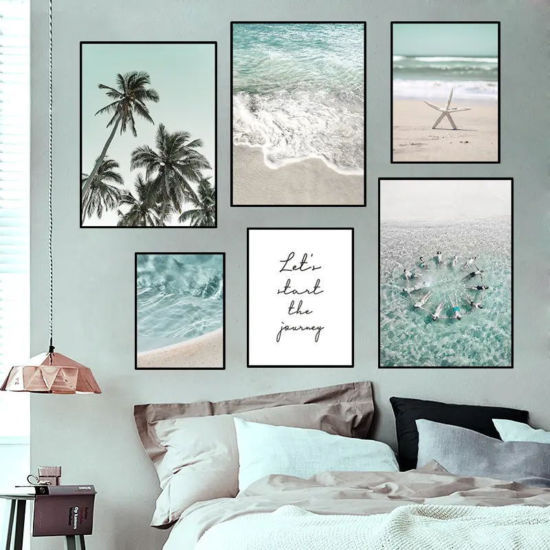 Постер с красивым пляжным пейзажем, современное путешествие, искусство на холсте, Тропическое дерево, украшение комнаты, морская волна, картина, Настенный декор FJ018