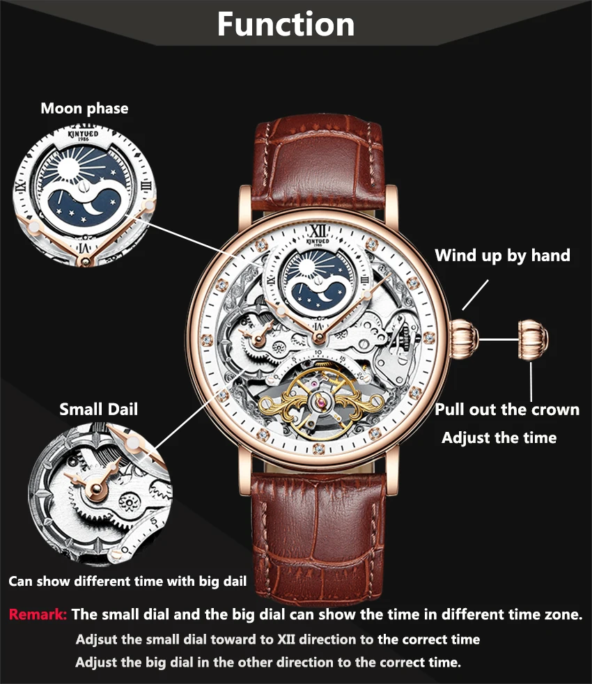 Часы KINYUED Мужские механические, автоматические водонепроницаемые повседневные с 2 часовыми поясами, 3 бара