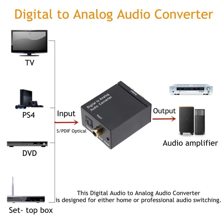 1. Этот цифровой аудио-аналоговый аудио конвертер предназначен для домашнего или профессионального переключения звука.2, он преобразует коаксиальные или toslink цифровые PCM аудио сигналы в аналоговый L/R RCA и 3,5 мм аудио одновременно (не может быть изменен).3, он поддерживает несжатый 2-х канальный импульсно-Кодовая Модуляция (LPCM) или PCM цифровой аудиосигнал Выход; Обеспечивает электромагнитную-безшумную передачу (5,1 канал несовместима, пожалуйста, установите аудио Выход для PCM или LPCM).4, простота установки и простота в эксплуатации; Используется для PS3, PS4, Xbox, Blu-Ray плеера, HD DVD, систем домашнего кинотеатра, AV А и т. Д.5. Обеспечивает электромагнитную передачу без шума.