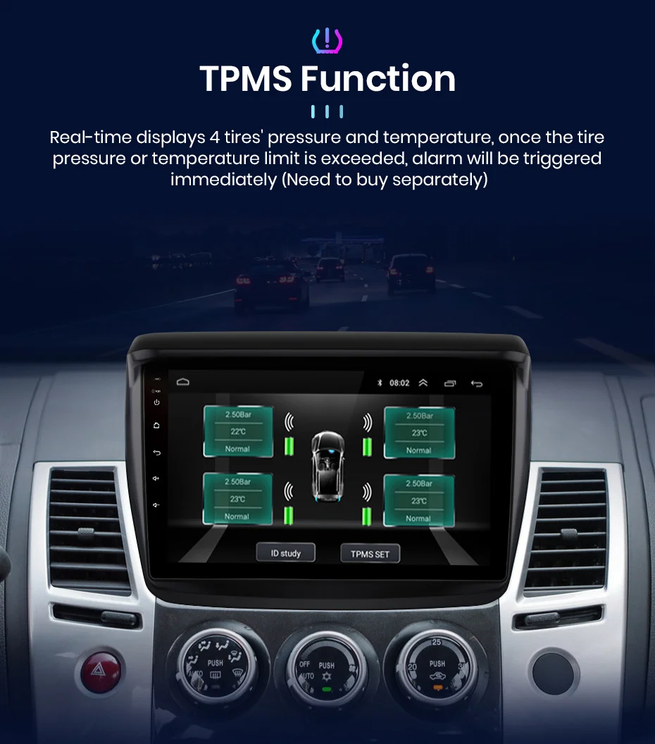 Отображает 4 давления и температуры в режиме реального времени. Как только давление или температура в шинах будут необычными, сразу же будет сигнал тревоги.