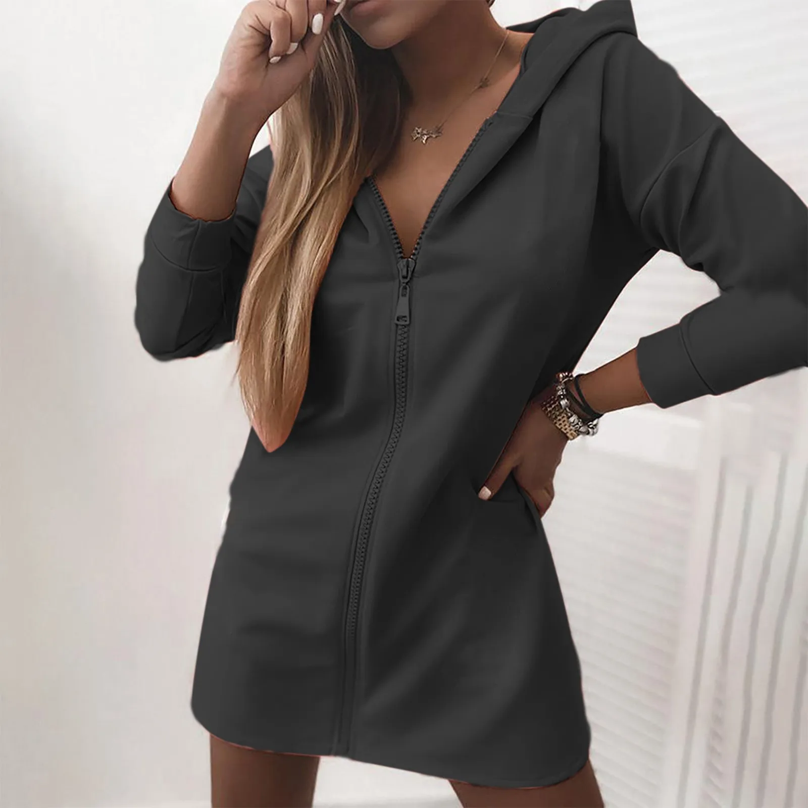 Платье с капюшоном на молнии, женское однотонное флисовое платье с капюшоном, осенне-зимнее платье-свитшот, трапециевидные облегающие пуловеры, сексуальное платье