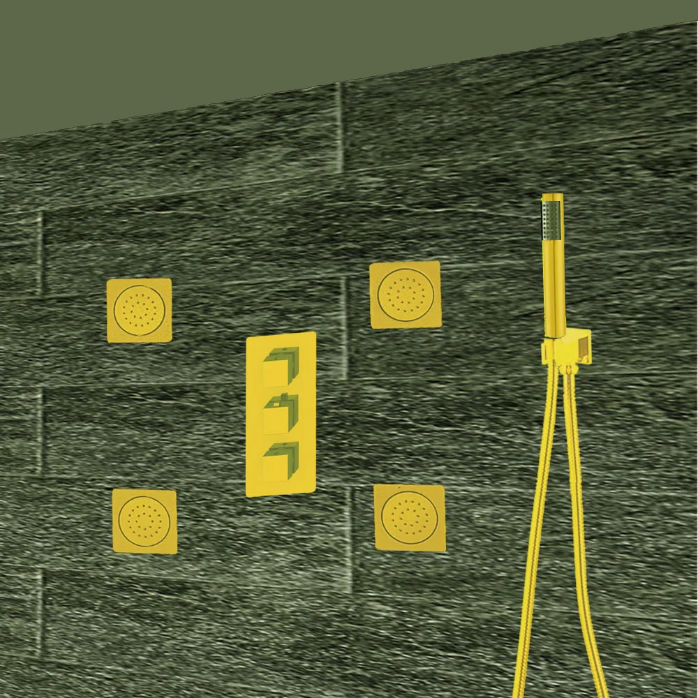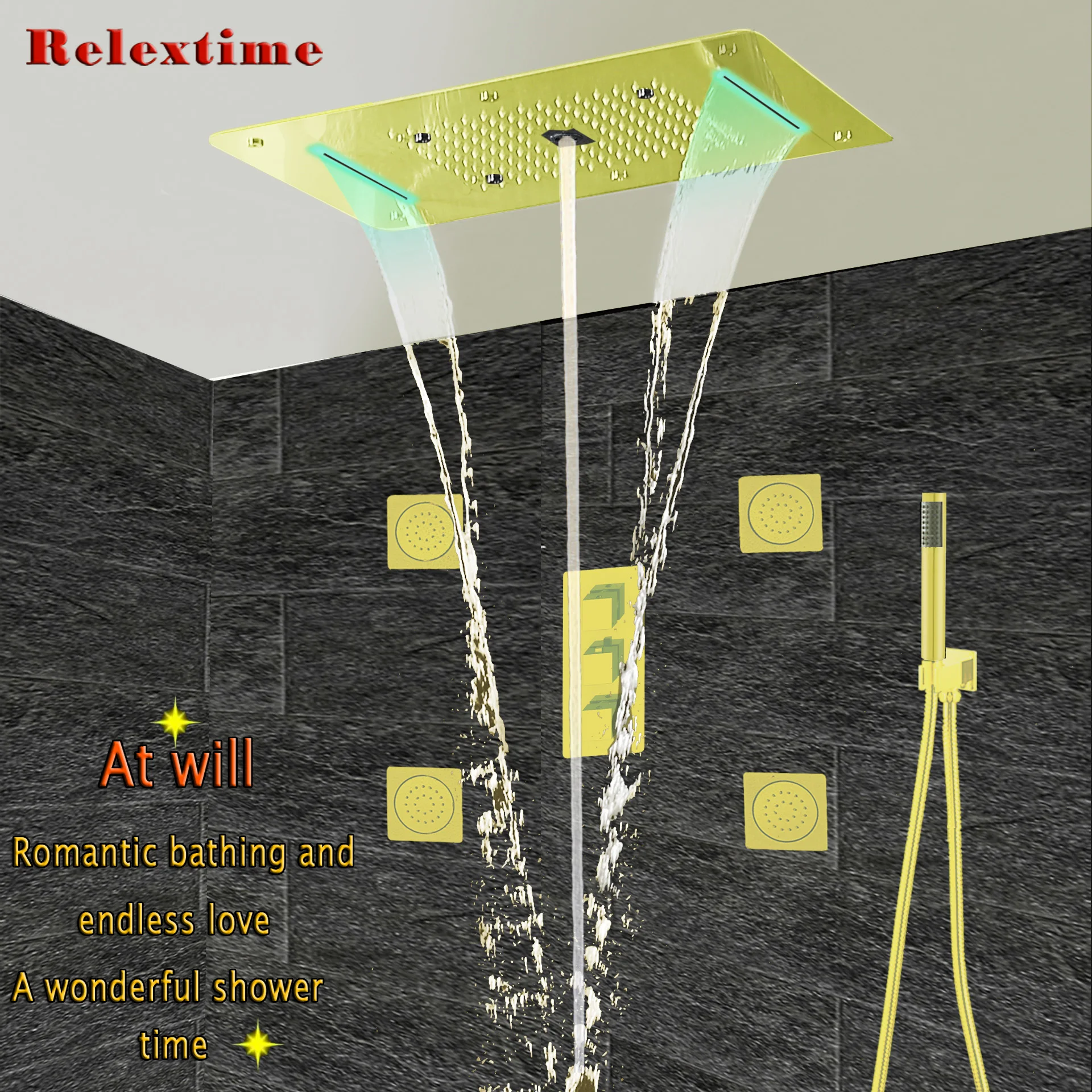 Матовый золотой Латунный душевой набор 6 функций термостатический смеситель с светодиоды для потолка в душе насадка дождевой водопад пузырь и туман, а также с массажными струями и ручным душем CF5422GD