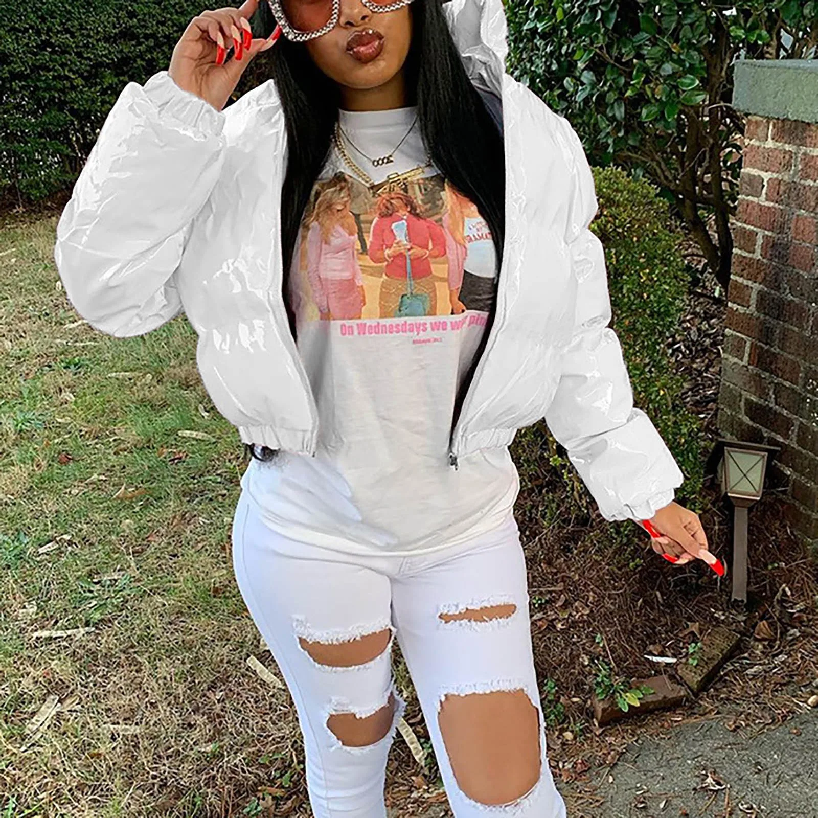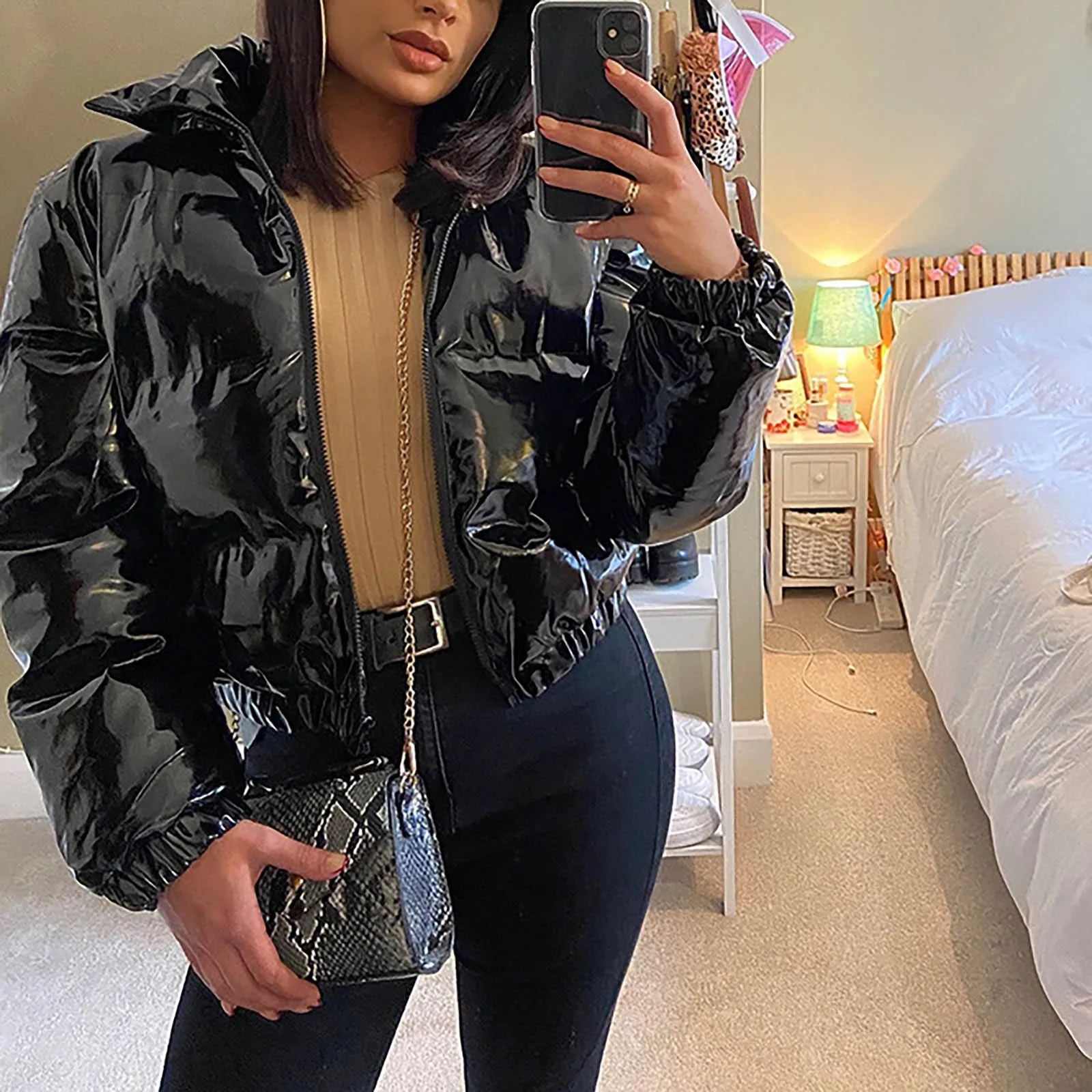 Женское короткое пальто на молнии, однотонный кардиган из искусственной кожи на белом утином пуху с зеркальным покрытием, зима 2021