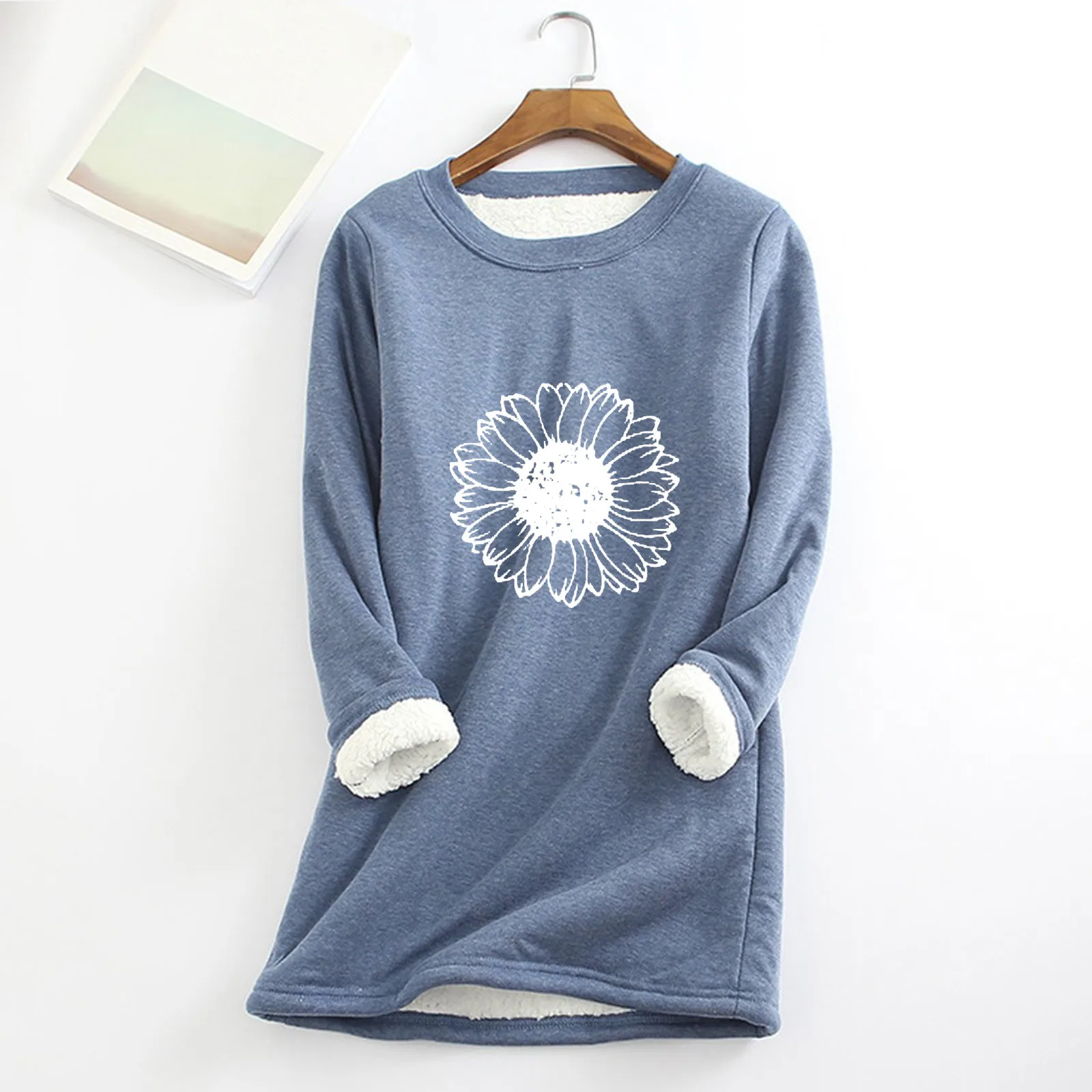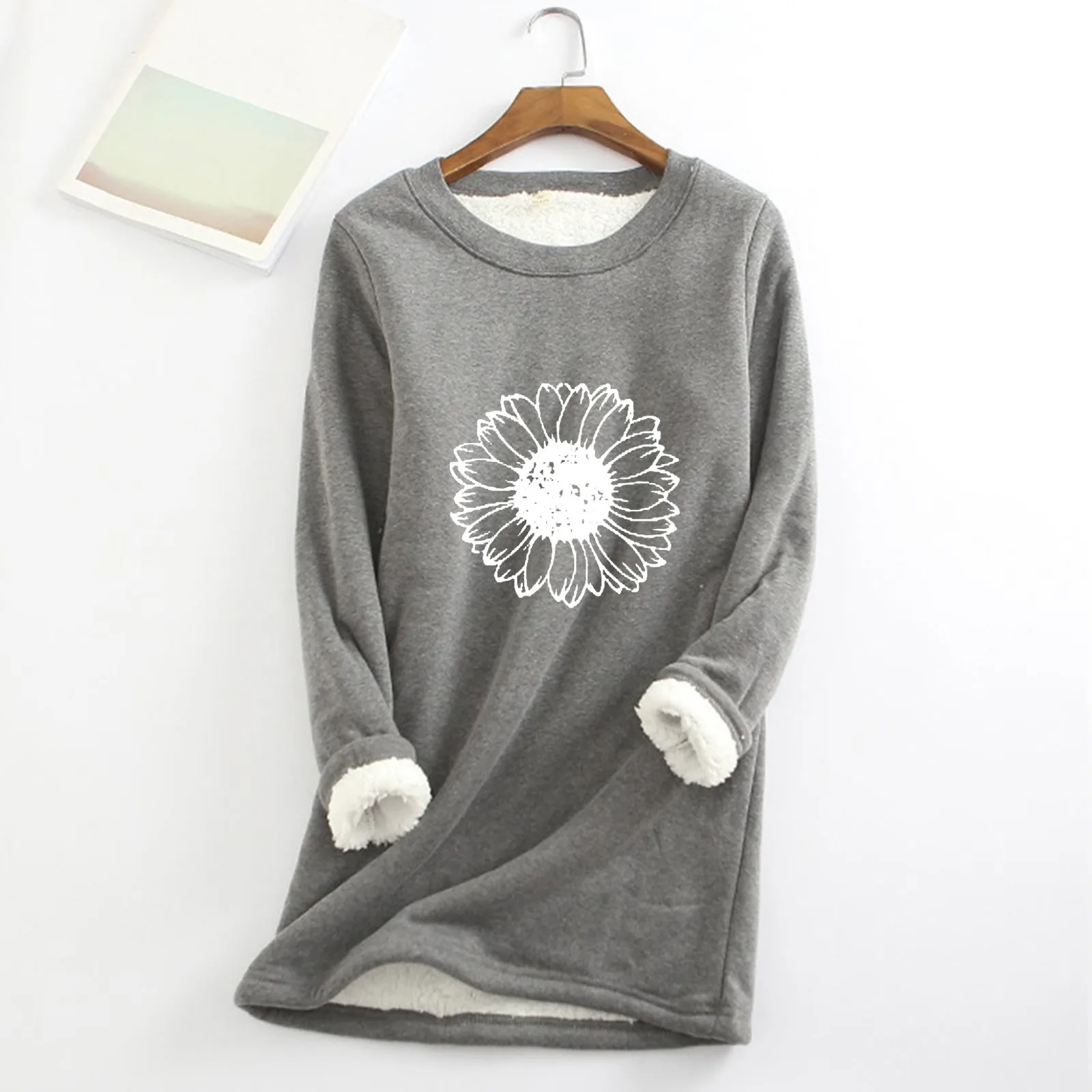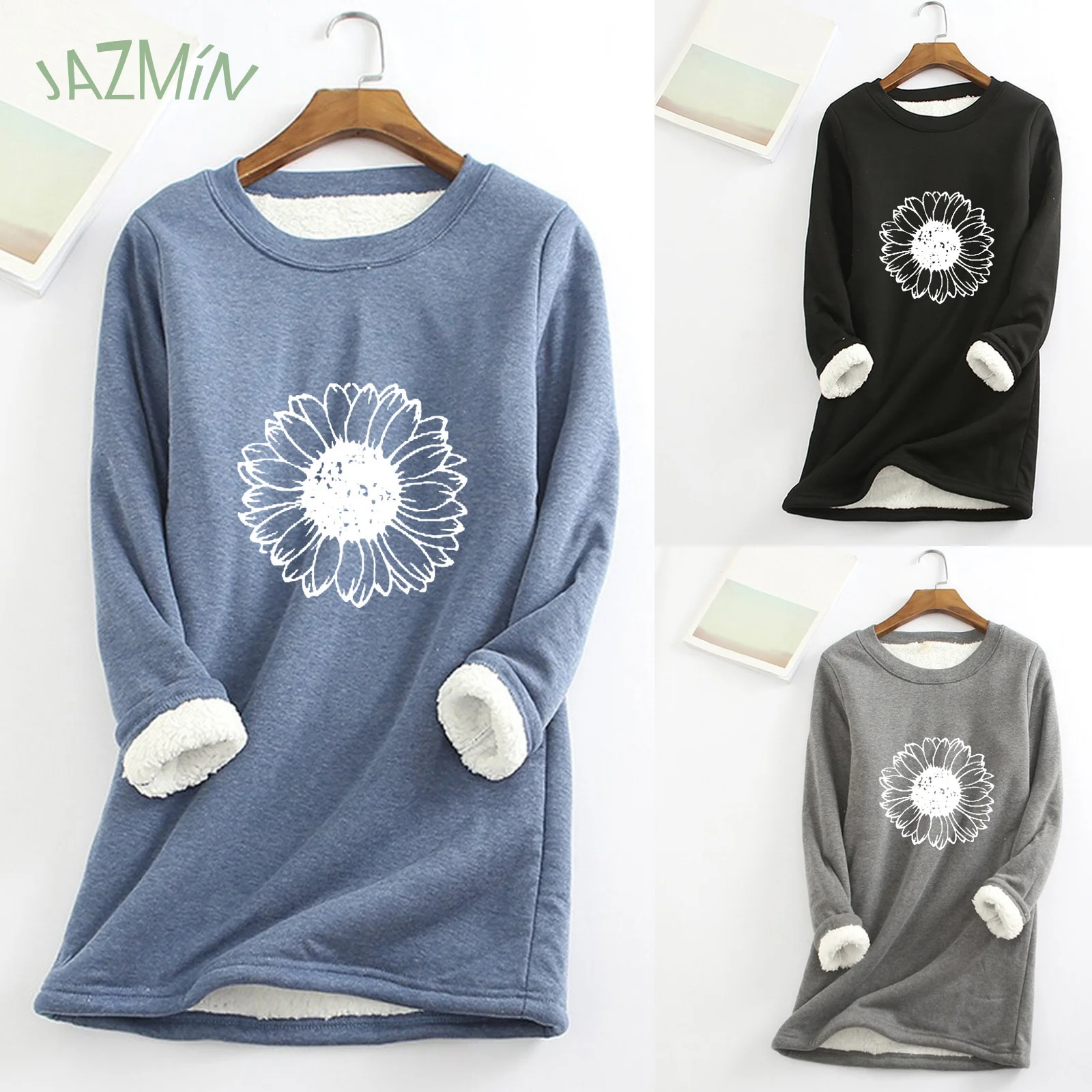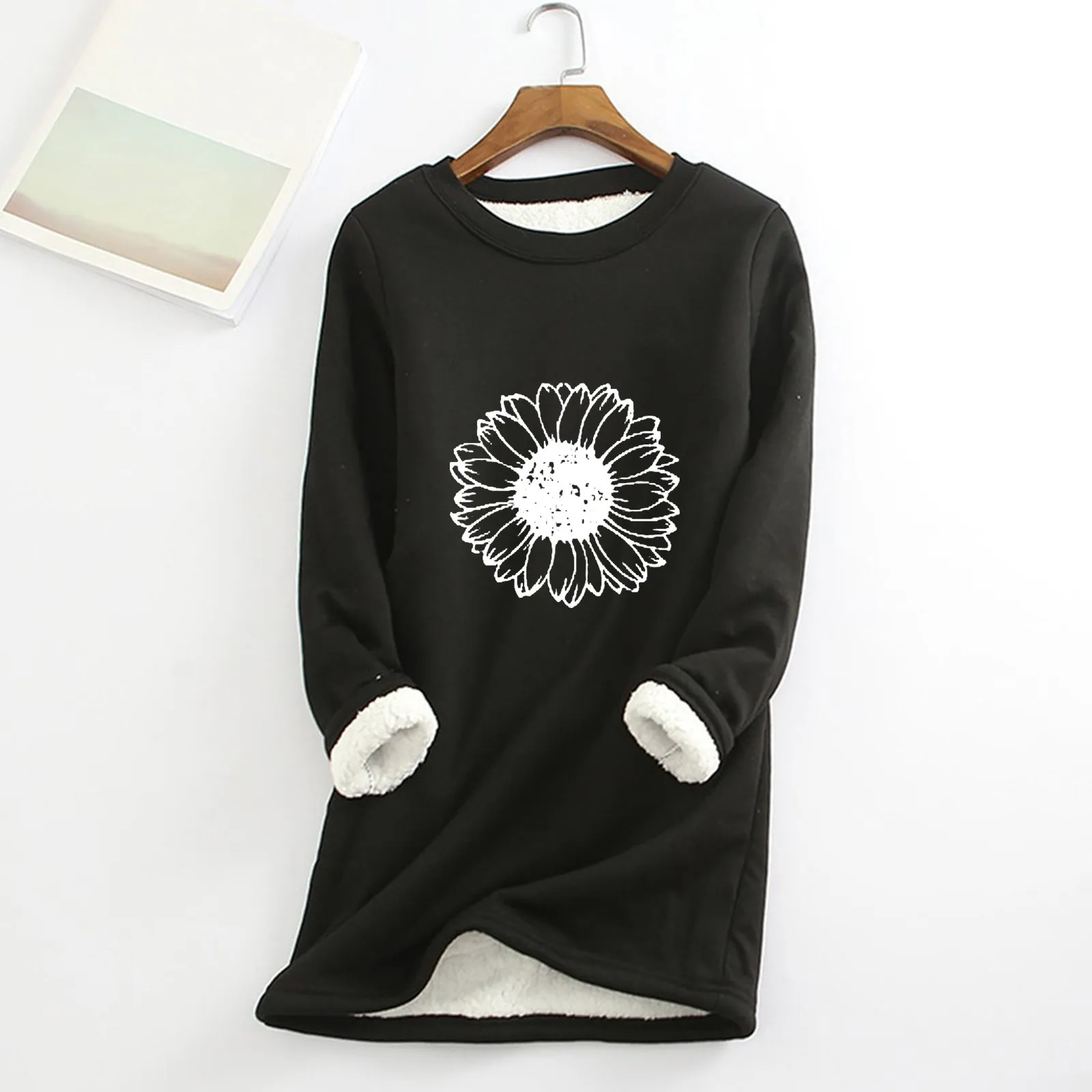 Женский свитшот с принтом, зимний Свободный Топ с круглым вырезом для домашнего использования, бархатный пуловер средней длины с длинными рукавами, худи, женская одежда